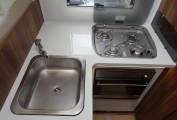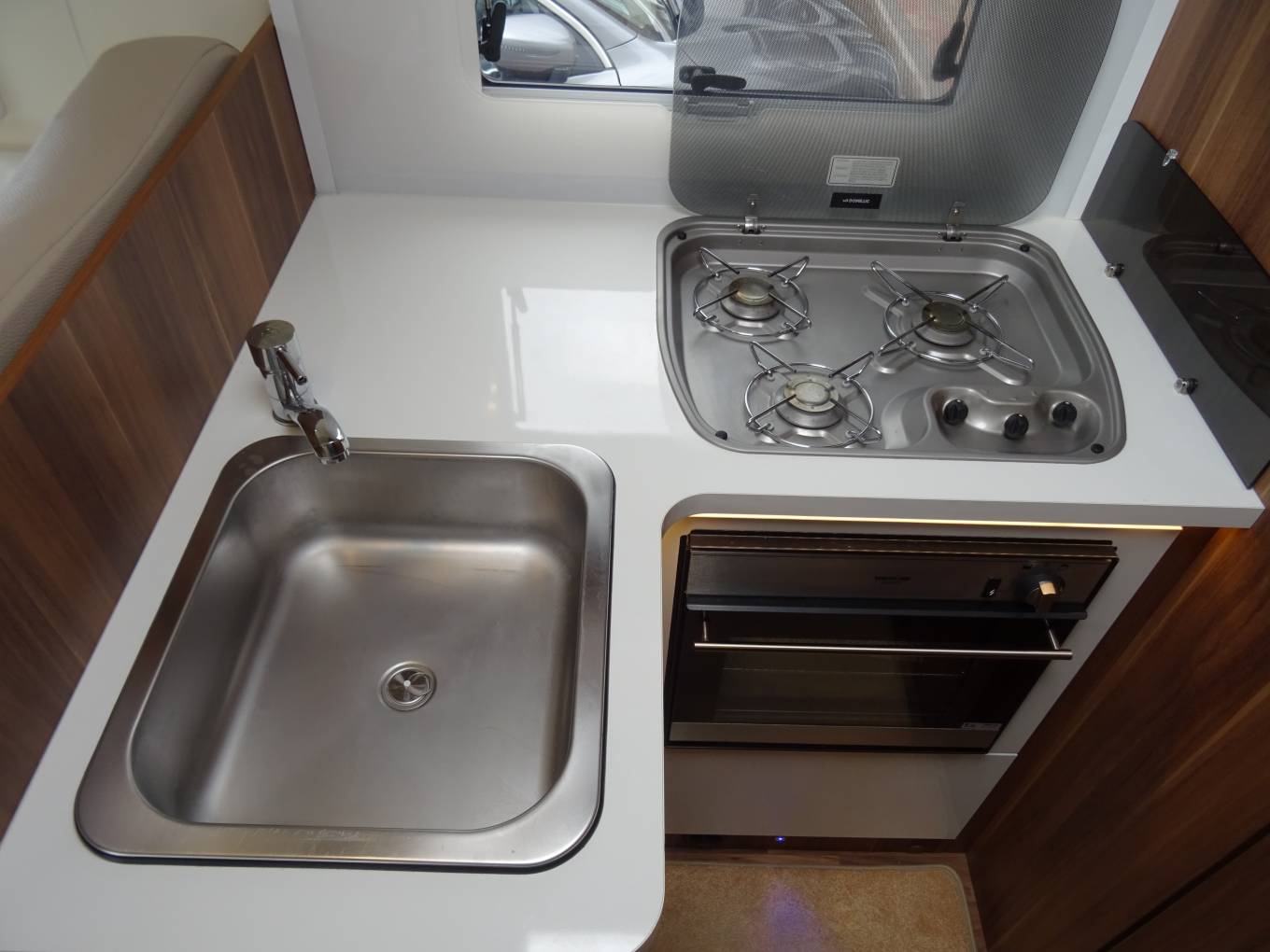 Moving forward you come to the kitchen which has a 3 burner gas hob, an oven with grill, a sink with mixer tap and a large 3-way fridge/freezer.