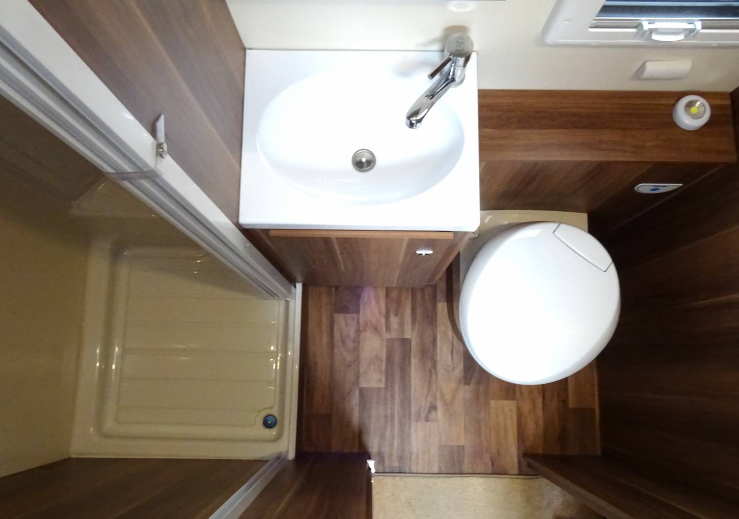 Starting at the rear of the Motorhome there is a good sized washroom with cassette toilet, wash basin with mixer tap and a separate shower cubicle.
