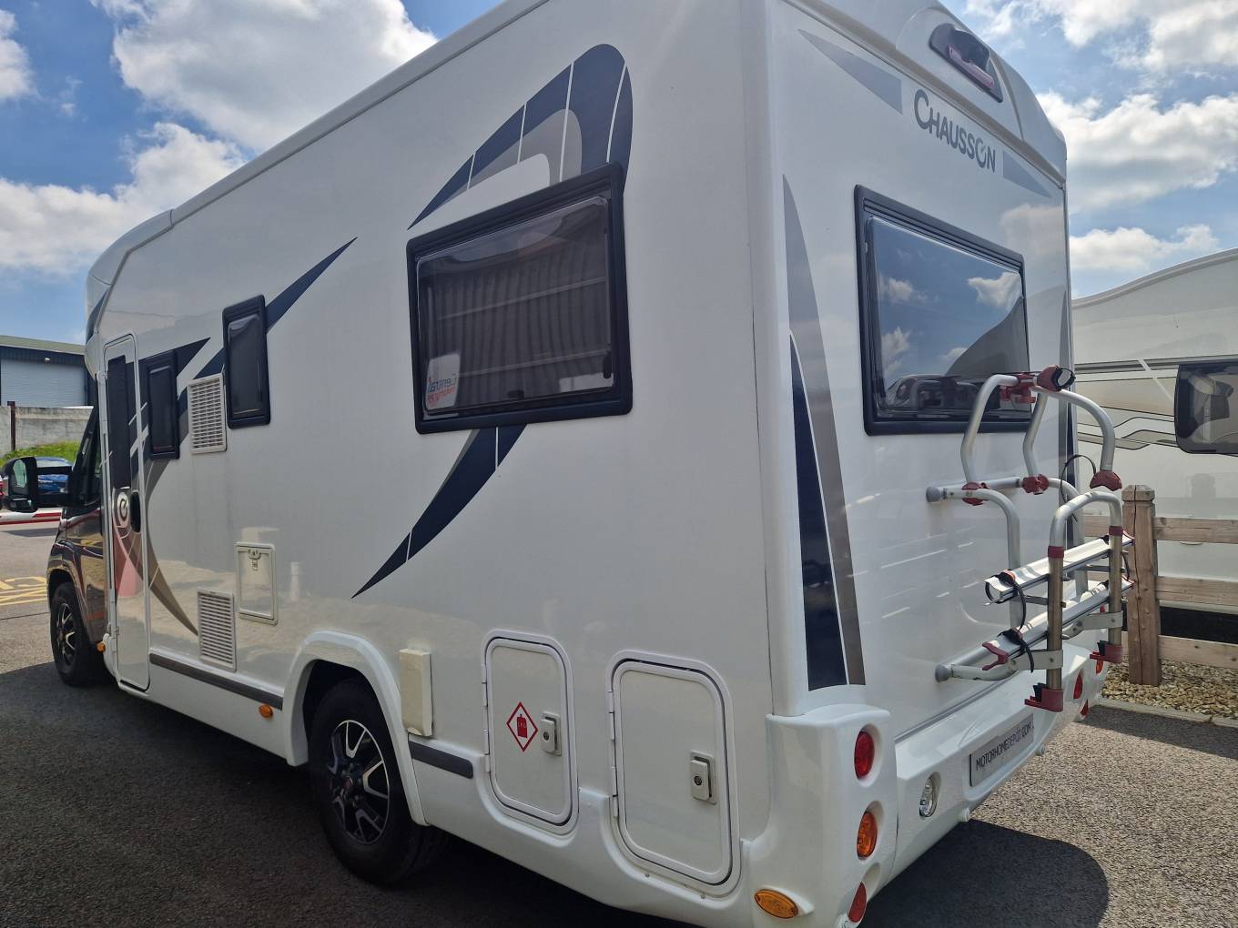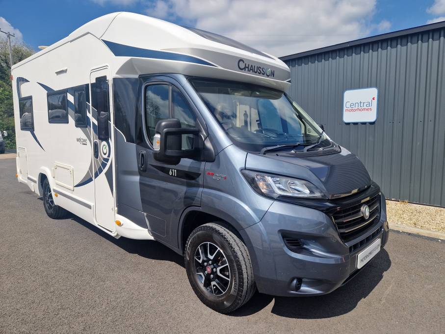 **THIS IS A UK REGISTERED MOTORHOME** 2017 Chausson 611 Welcome 4 berth motorhome for sale. Presented in nice condition with a very spacious layout including a rear lounge area with drop down bed, front lounge area with drop down bed, 4 travel seats and a midship kitchen and washroom area. A rear hold area makes great space for storage. The high specification includes the Fiat Ducato 3500kg chassis with an upgraded 150hp engine, reverse camera, solar panel, bike rack, cab air con, cab shades, parking sensors, on board water tanks, on the road heating, 2 x leisure batteries and much more. Sale will include full mechanical service including timing belt, 4 new tyres, gas certificate and one years warranty. Finance and part exchange available. Please call for further details….