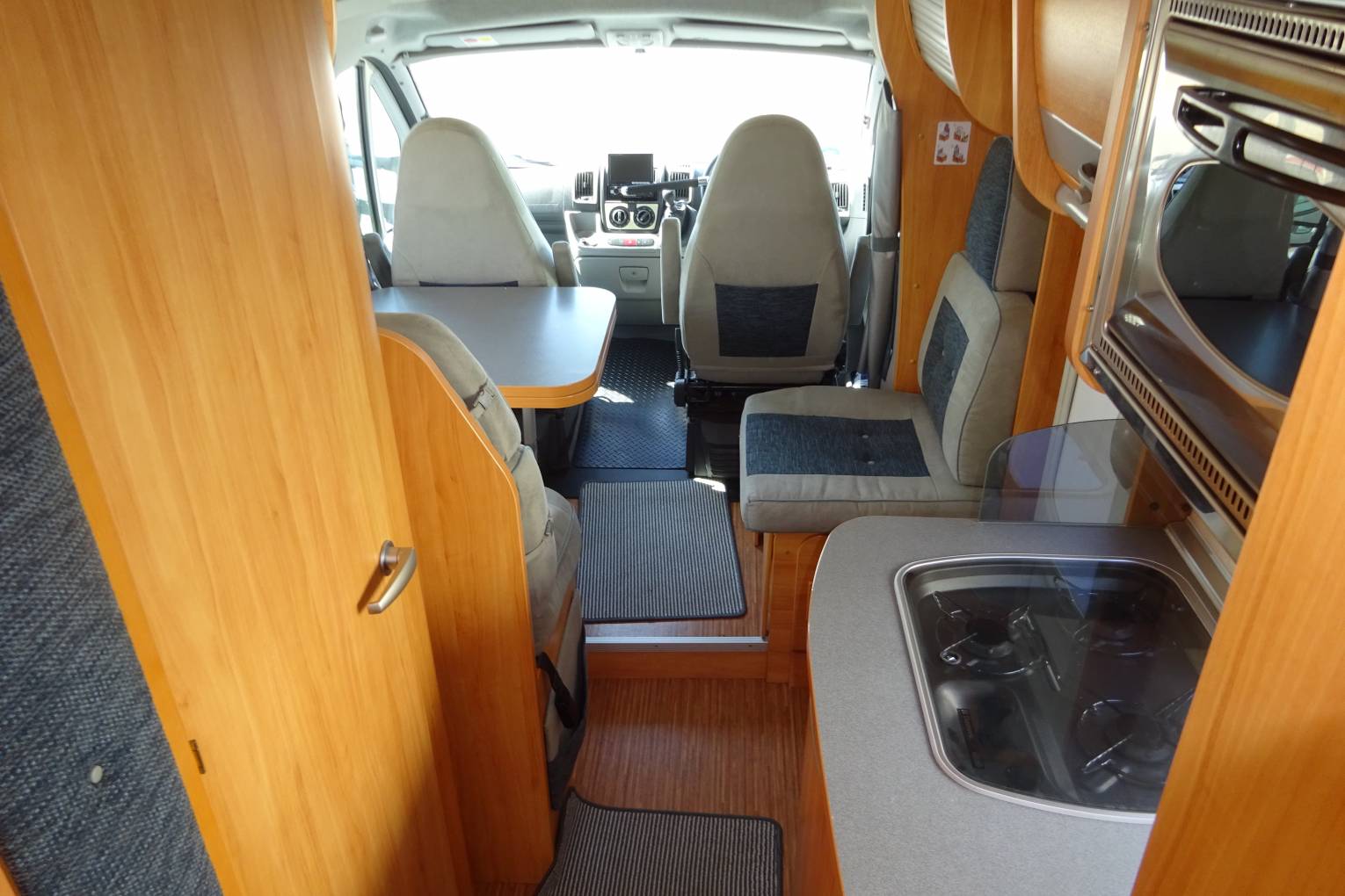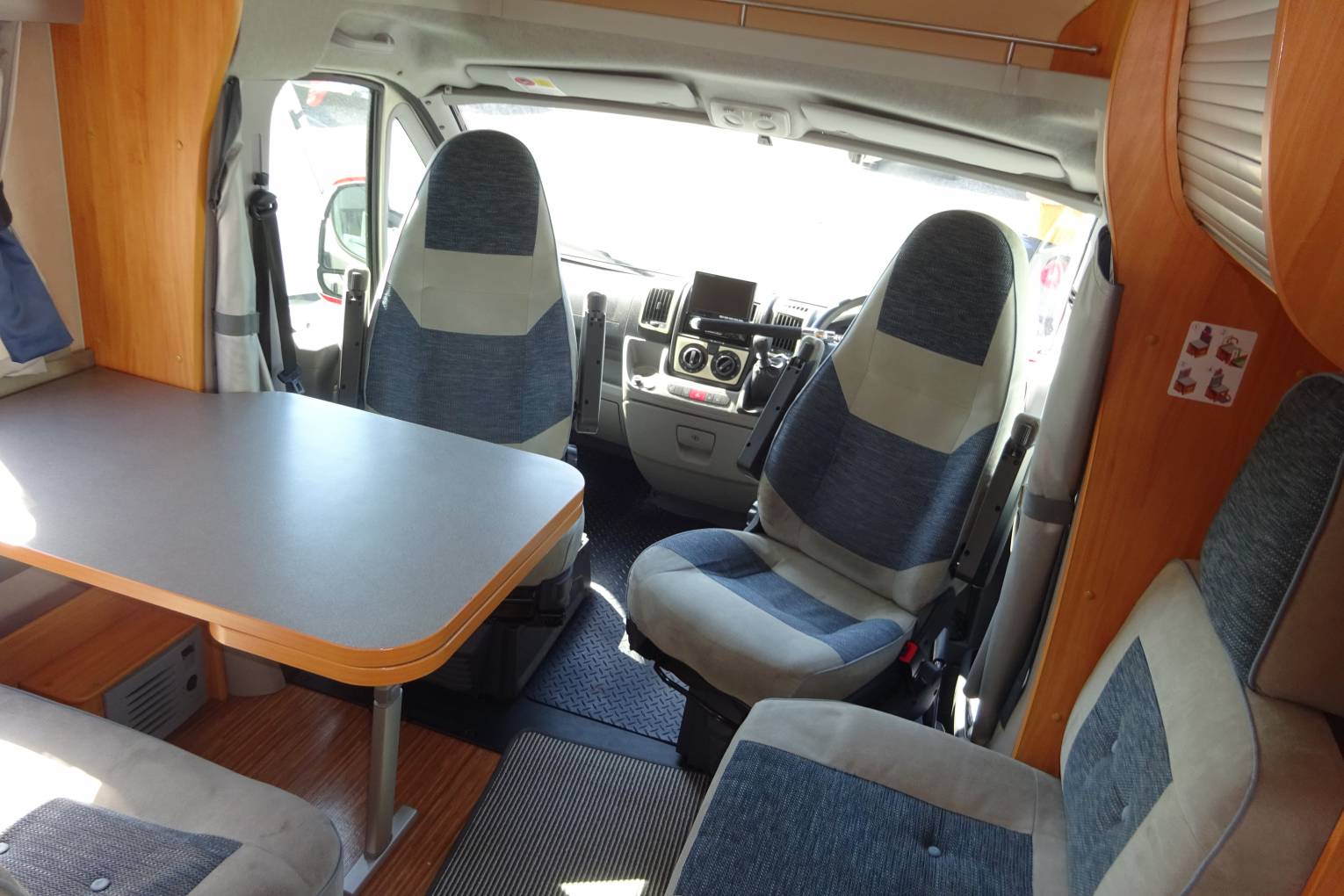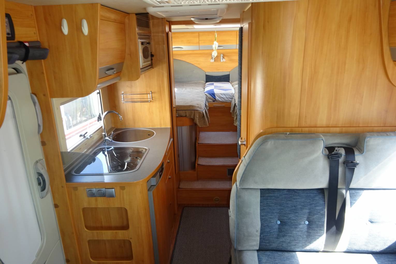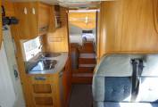 As you step inside the motorhome you can see how well maintained it has been kept. At the front of the motorhome you find a large seating area that benefits from two captains chairs to supplement the settees allowing seating for 5 around the table. It has a well equipped kitchen with a large fridge with ice box, 3 burner gas hob, oven, and sink. Adjacent to the kitchenette you find the bathroom fitted out with a toilet, sink and separate shower cubicle all in excellent condition. At the rear of the motorhome you find twin beds that can be made in to a large double if required. A third bunk can be made up from the lounge area that may be big enough for two young children. There is plenty of storage throughout the motorhome and benefits from a large rear garage that could comfortably hold anything you may wish to take with you!