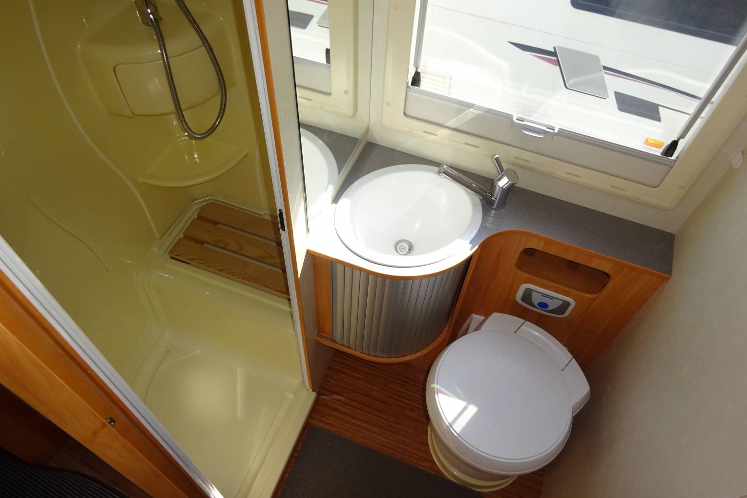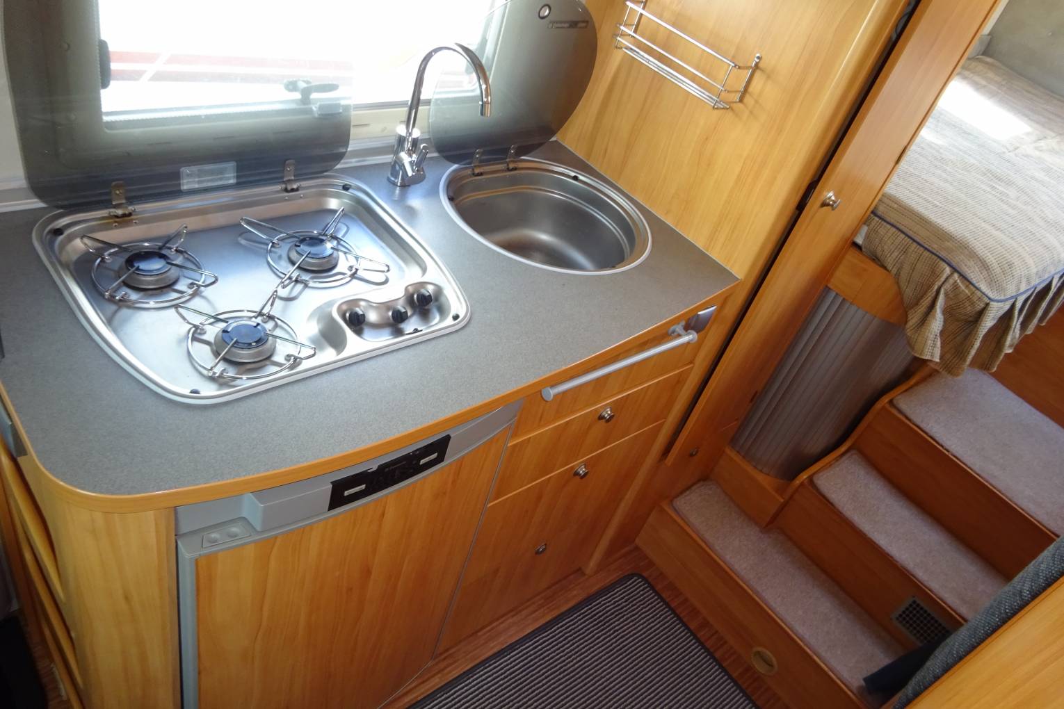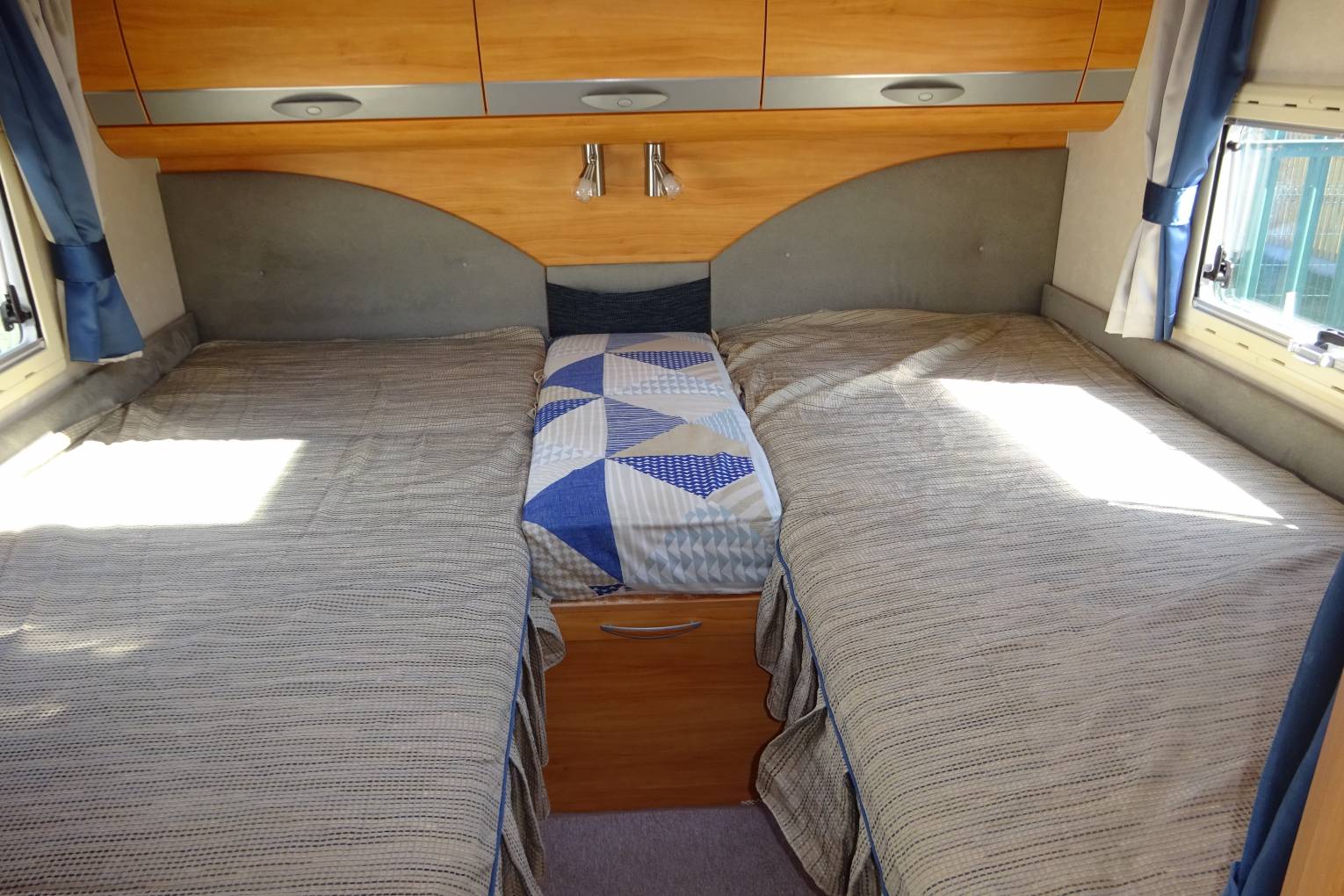 As you step inside the motorhome you can see how well maintained it has been kept. At the front of the motorhome you find a large seating area that benefits from two captains chairs to supplement the settees allowing seating for 5 around the table. It has a well equipped kitchen with a large fridge with ice box, 3 burner gas hob, oven, and sink. Adjacent to the kitchenette you find the bathroom fitted out with a toilet, sink and separate shower cubicle all in excellent condition. At the rear of the motorhome you find twin beds that can be made in to a large double if required. A third bunk can be made up from the lounge area that may be big enough for two young children. There is plenty of storage throughout the motorhome and benefits from a large rear garage that could comfortably hold anything you may wish to take with you!
