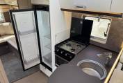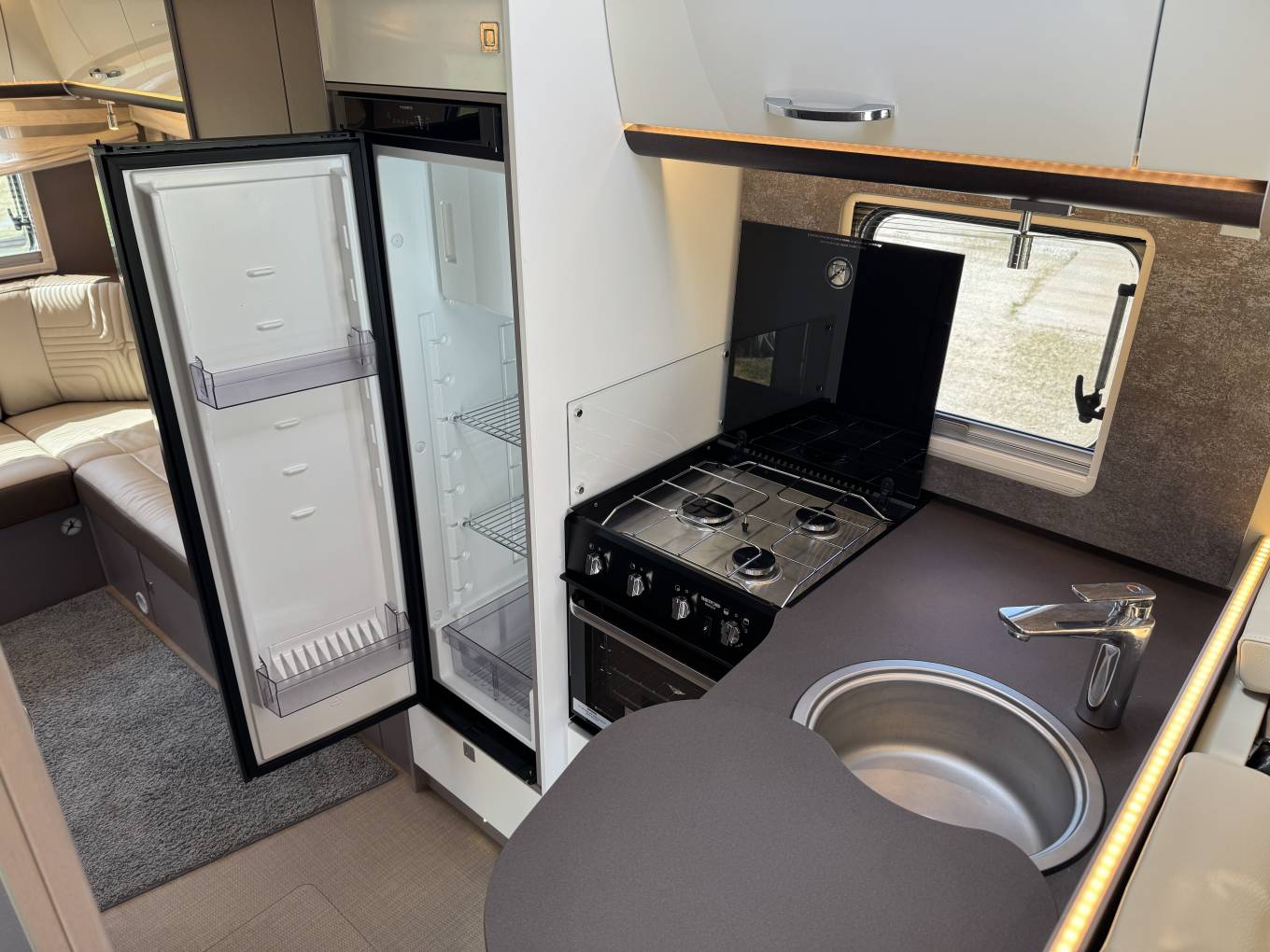 Carrying on through the motorhome, we come to the kitchen area where there is a oven along with a 3 ring gas hob supplied from the refillable autogas bottle system located in the garage in its own storage unit. Next to the cooker is the sink with mixer tap and last but not least there is a large full length 3 way Thetford fridge with freezer compartment.