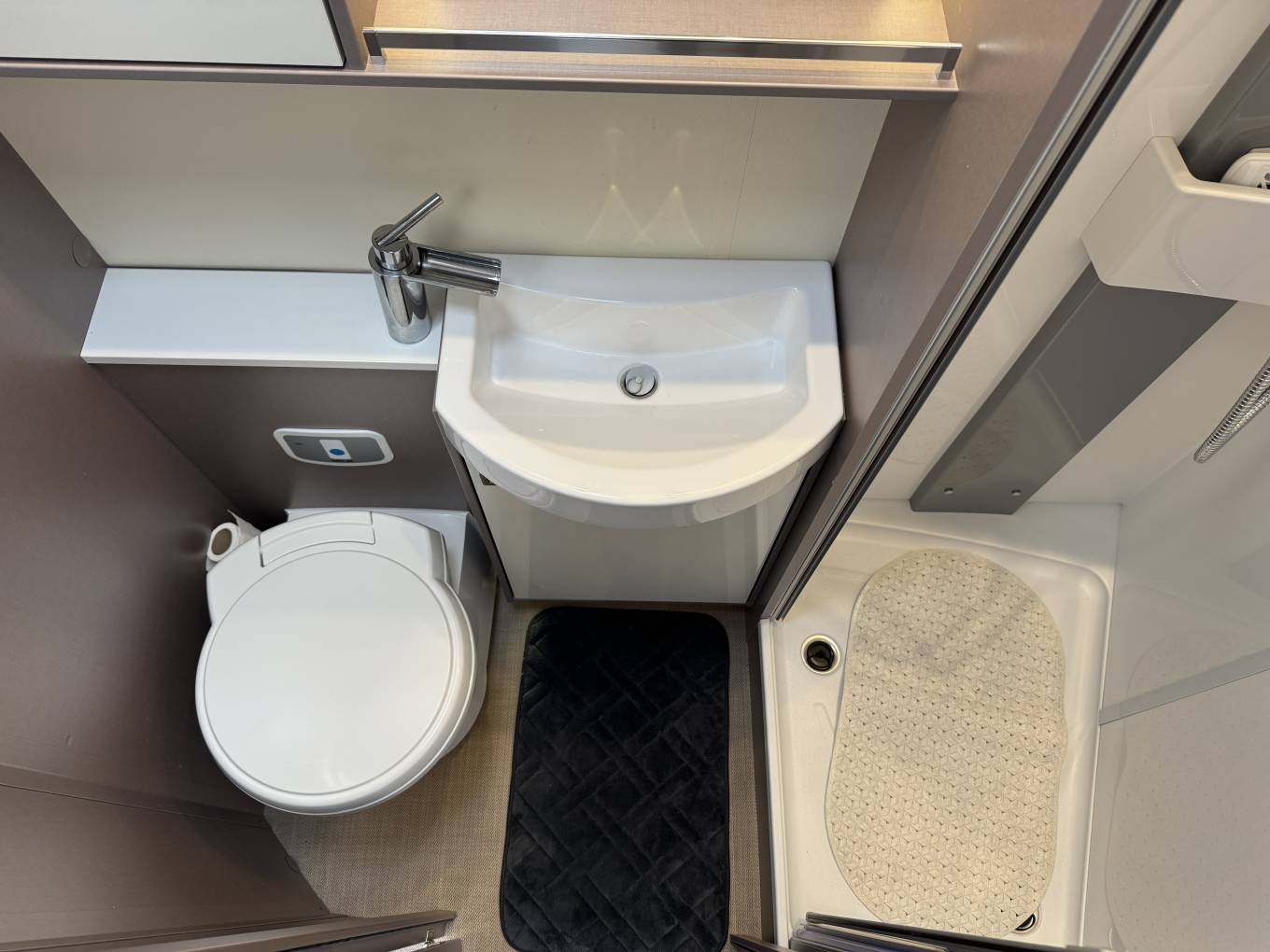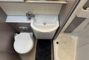 Moving through to the centre of the motorhome, There is a large washroom which includes a full length separate shower, wash basin with mixer tap, cupboards and a separate Thetford toilet with further storage units. This area can be separated off from the rear lounge for that much needed privacy.