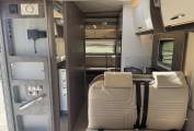 As we head towards the front of the motorhome, we come to the lounge/dining area where there are the rear two travelling seats with a further single seater sofa adjacent to it. At the front there are driver and passenger seats that both swivel to face the large dining table that is positioned in between that offers that warm family dining experience. Above this is area is the second electric drop down bed.