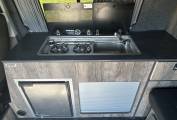 The campervan also includes a Porta Potti 335 toilet for convenience and a 25 litre underfloor water tank with an external filler cap, electronic level gauge, and an on-demand Shurflo water pump. Power management is handled by an AGM system with a leisure battery supported by mains electric hookup, 12V, 240V, and USB power points.