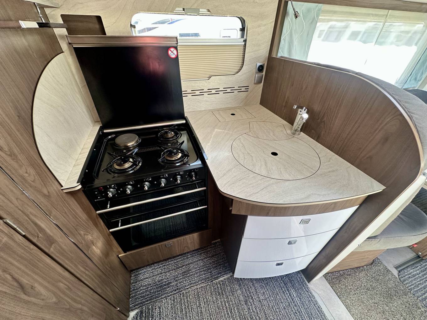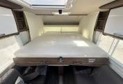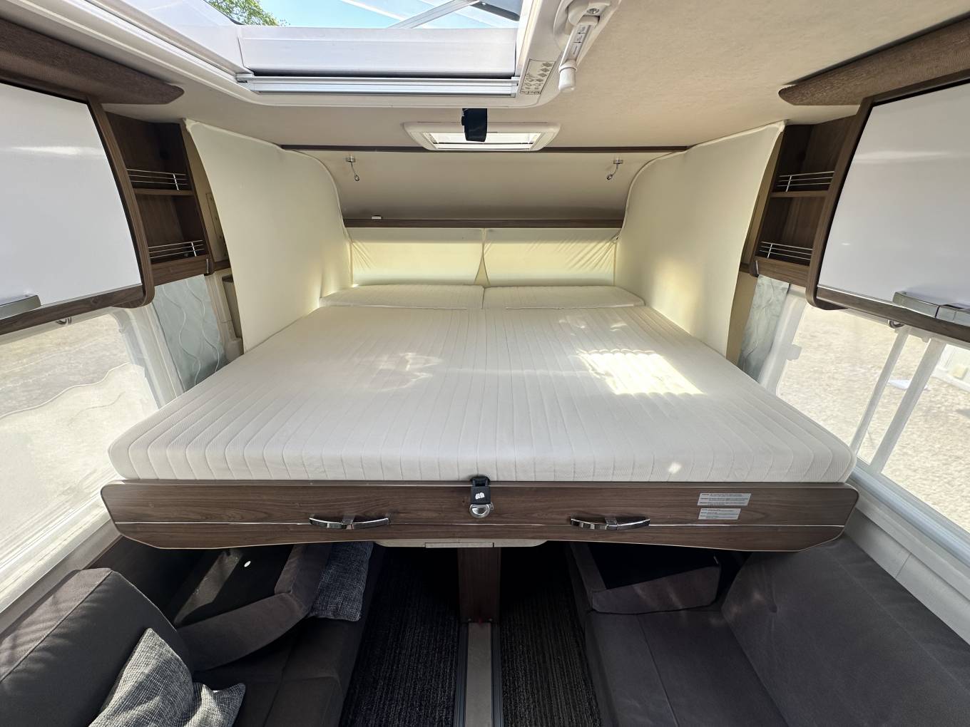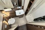 Starting at the rear of the motorhome there is a luxury washroom featuring Thetford cassette ceramic toilet, wash basin, large mirror, separate shower and plenty of storage. Moving forward there is a beautiful, well equipped, kitchen featuring a hob with three gas burners and electric hot plate, sink with mixer tap, a combination oven and grill, large fridge and separate freezer and an extendable work surface. This kitchen also comes with plenty of storage space for all your ingredients and a cocktail cabinet. In the heart of the motorhome you will find the perfect area to either relax and enjoy a good book, watch TV or even a glass of wine. The plush sofas provide a really comfortable place to put your feet up and enjoy being in this wonderful motorhome. This area also provides the perfect dining area, with an expandable and directional dining table and swivelling captains seats, you can comfortably seat 6 in luxury and comfort. Above the living area is the electric drop down bed. This is simple to operate and the extra large bed means you can have the option of sleeping transverse or length ways in complete comfort. This is a fabulous bed and really makes staying away in the Frankia the height of motorhome luxury.