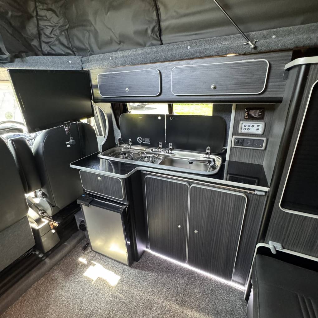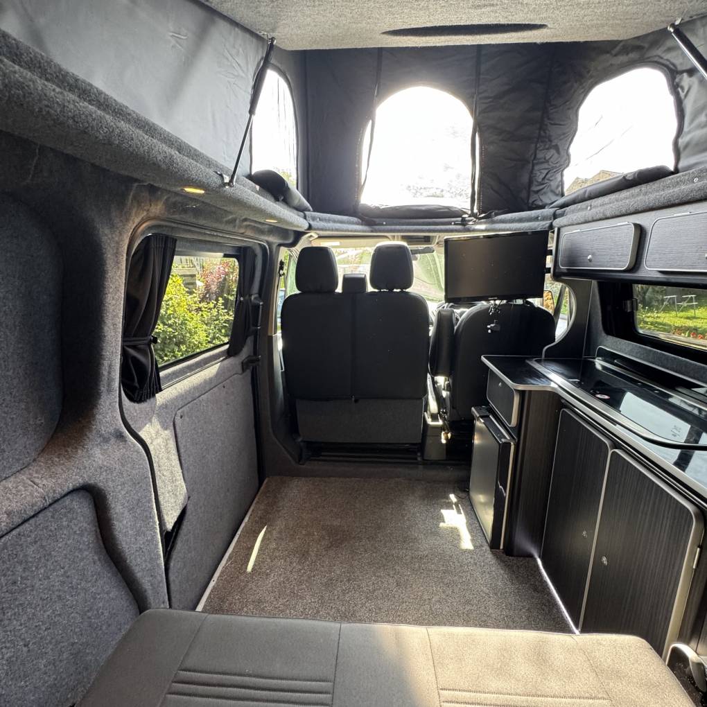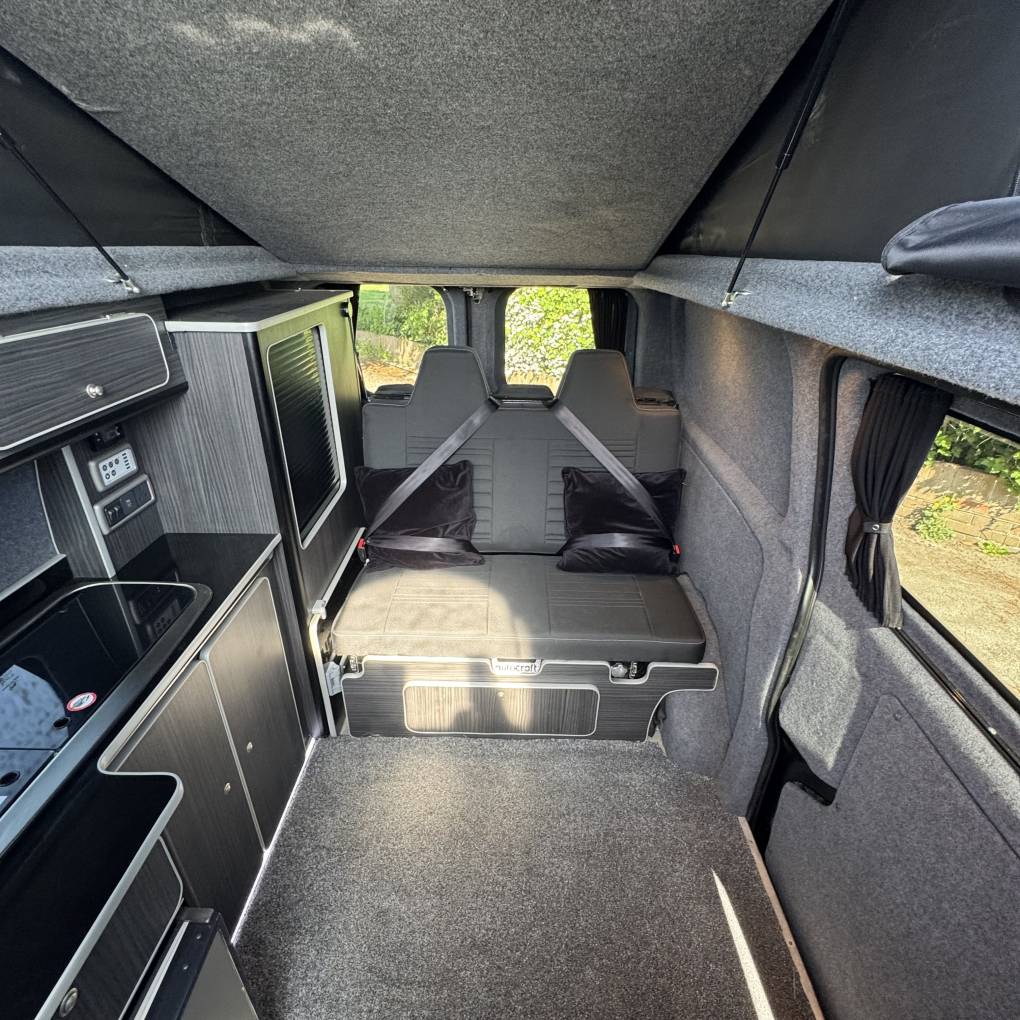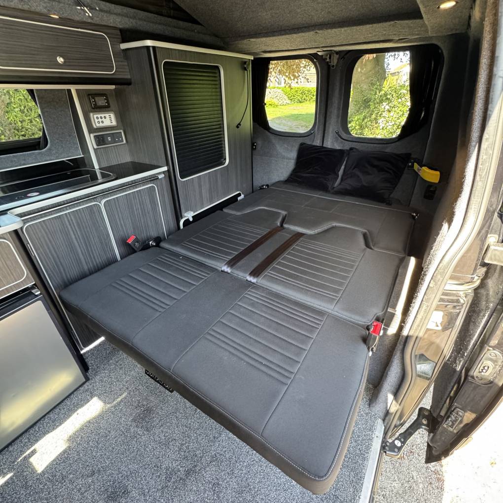 Welcome to the sale of this Ford Transit Custom Camper. This versatile camper comes with sun canopy and free standing driveaway air awning. TV, fridge, two ring cooker, sink, gas bottle in locker, pull out bed with rear seat belts fitted, diesel night heater, thermal blinds for night time and windscreen blackout cover etc. LED interior lighting, Leisure Battery fitted and 230v Hook-Up. Air Con, Cruise Control, Speed Limiter & DAB Radio. Heated seats, Bluetooth, Ford Sync, Folding Mirrors, cornering lights, Courtesy Lighting and front and rear parking sensors. Passenger seats rotate for dining, playing games etc and has foldaway table. Comes with towbar fitted for bike rack/trailer etc. Will sleep four people and all certification included including pop top receipt.
