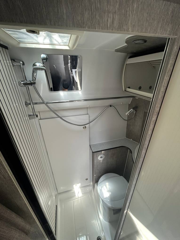 LAYOUT - To the rear of the camper, you will find the washroom which includes a Thetford cassette toilet, vanity handwash basin and integrated shower.