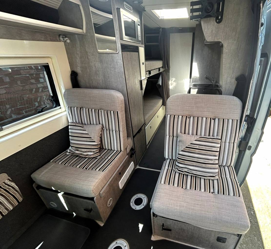 The camper comes with 4 travelling belts, DAB radio, Bluetooth, USB points, cab air con, cruise control, reversing camera, sat nav, Remis front cab blinds, alarm & tracker, Truma hot water and heating system, solar panel, aerial, carpets, bike rack, wind out awning, Gaslow LPG tank, alloy wheels, electric step and 240v hook-up cable.