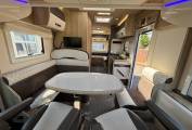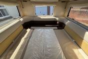 At the rear is a U-shaped lounge with overhead and under-seat storage. A freestanding dining table can be stowed away when not in use. This area converts into a spacious double bed.