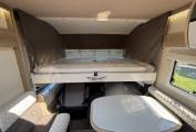 The habitation door is located on the nearside. Upon entry, there is an L-shaped lounge and dining area featuring a double forward-facing travel seat with two seatbelts, a single side-facing seat, and the two swiveling cab seats. An adjustable table serves this seating area. Above the cab is a double drop-down bed.