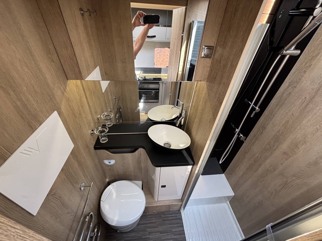 Opposite the kitchen is the shower room with a 12V flush toilet, hand basin, towel rail, mirror, storage options, and a separate enclosed shower cubicle.
