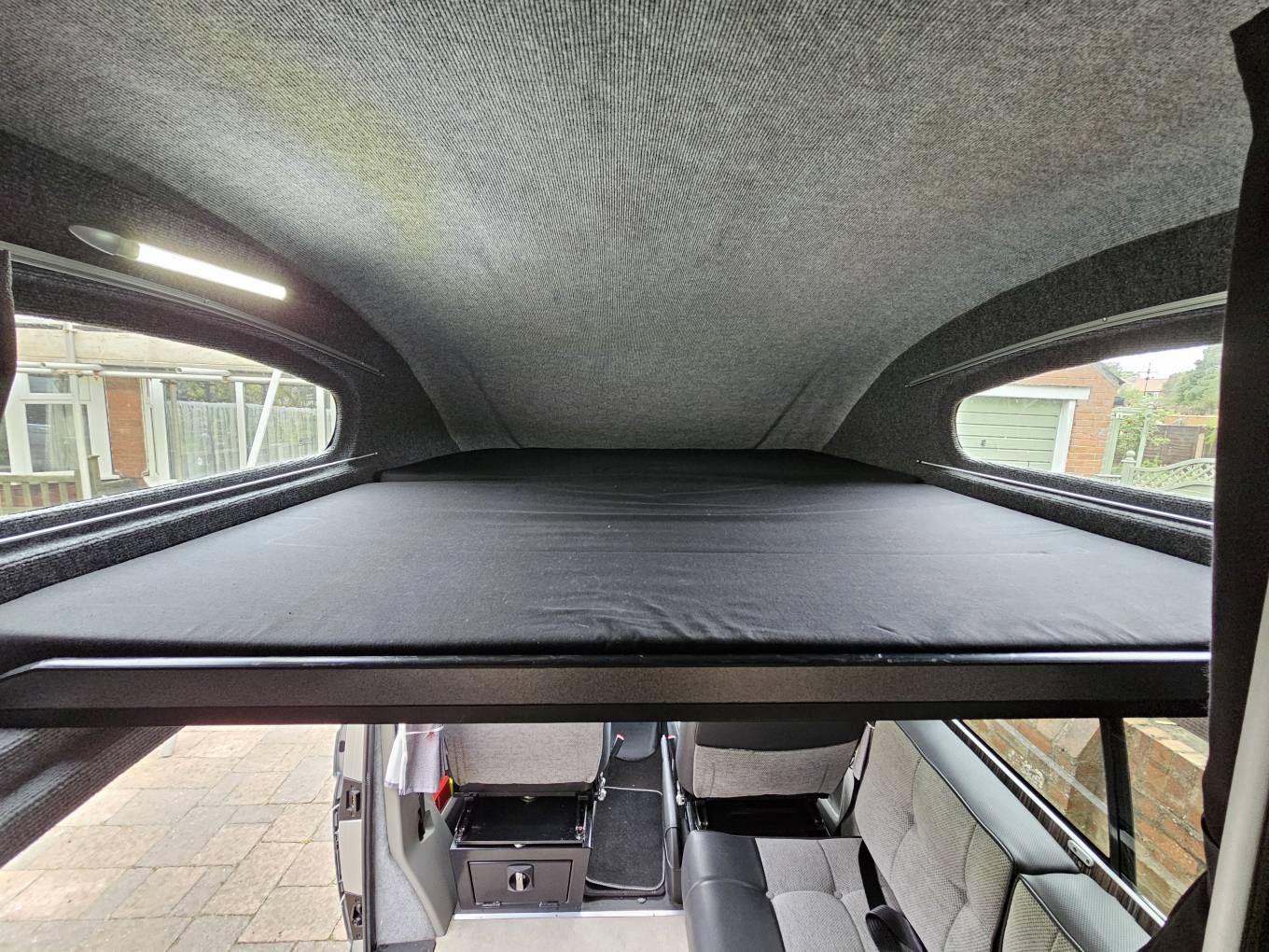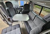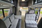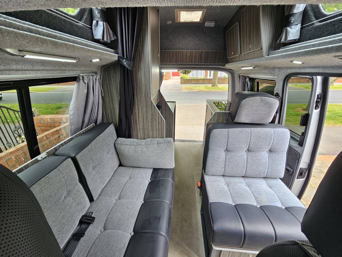 Inside, it offers three belted seats and sleeps two adults and one child, with a fold-flat rear bed and a raised overhead platform. The front captain seats swivel to face a removable dinette table, creating a sociable lounge area. The interior feels modern and comfortable, with carpet-lined walls, LED touch lighting, and a well-designed layout perfect for couples or solo travellers.