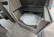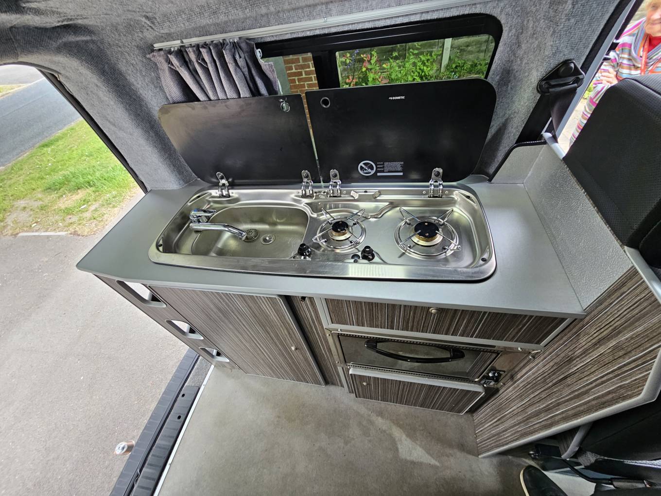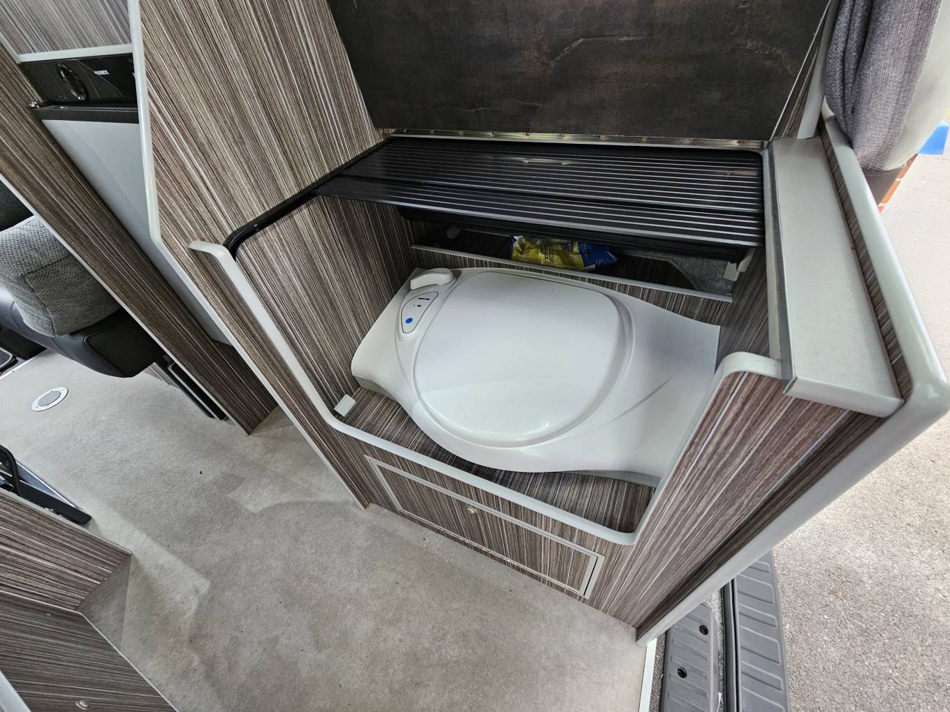 The kitchen includes a stainless steel sink, twin gas burners, an oven with grill, and a Dometic 3 way fridge. A cassette toilet is neatly tucked away at the rear behind a tambour door. Heating is provided by a Webasto diesel heater, and mains hook-up powers standard sockets and USB charge points.