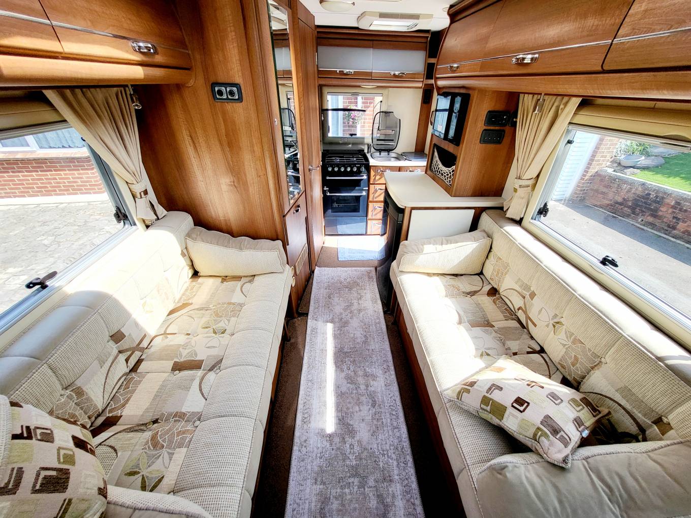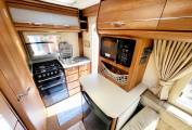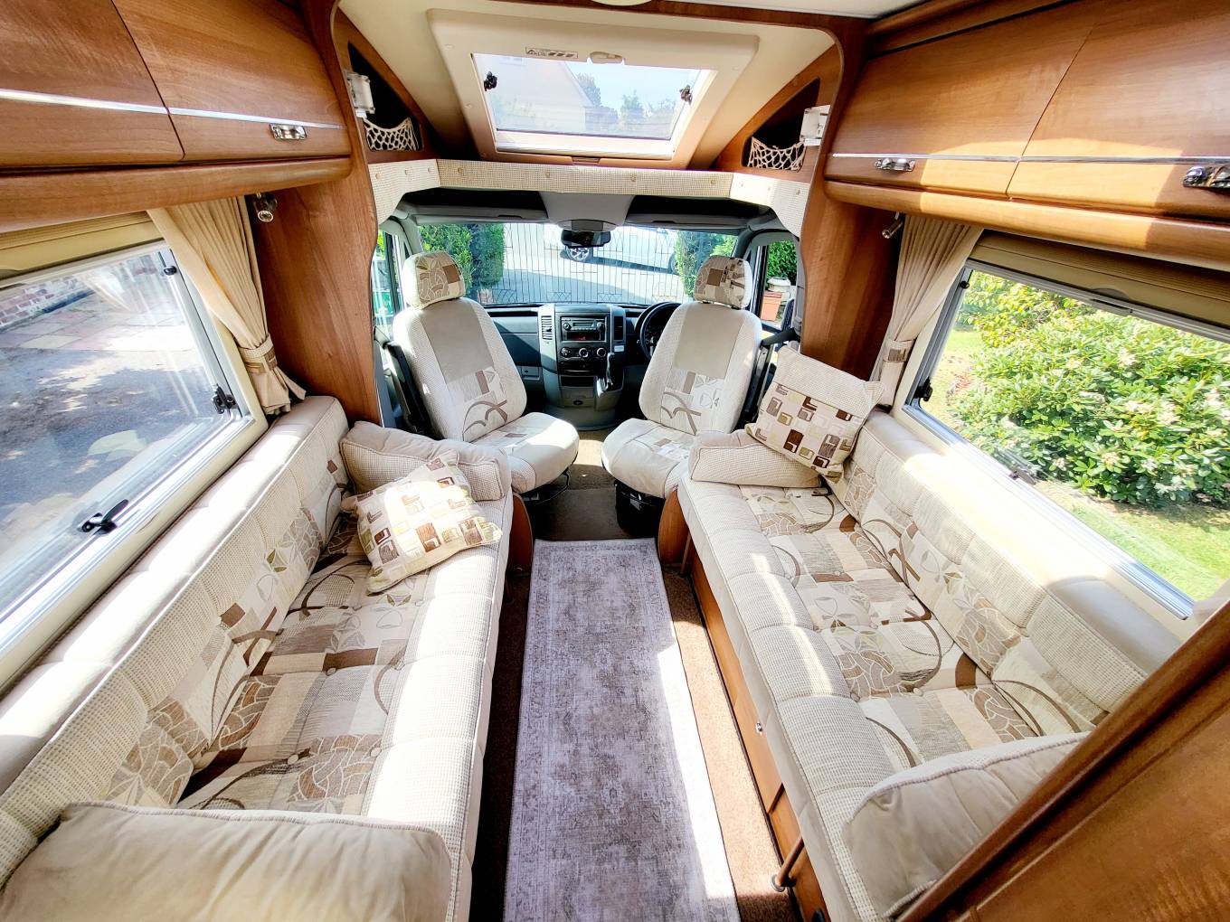 Truma gas and electric blown-air central heating and hot water, carpets throughout, black-out blinds and fly-screens throughout.