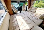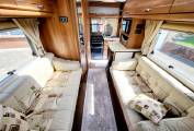 The lounge area is very bright and airy with two large side windows and a large sunroof, two parallel side sofas that pull together in the evening to make a large double bed. There is a large folding dining table that stores away when not in use, overhead storage and under-seat storage available.