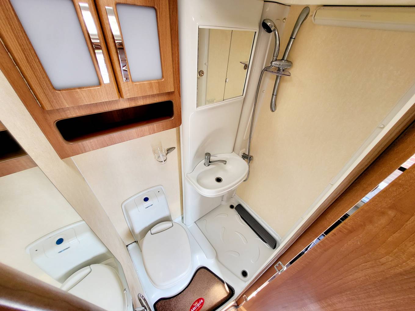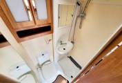 The washroom is very well designed, with a built-in washbasin with chrome tap and mirrored cabinets above, the whole panel swings out towards the toilet to reveal a large separate shower cubicle, so the rest of the washroom stays dry whilst you’re showering, plus there’s a Thetford cassette swivelling toilet with electric flush.