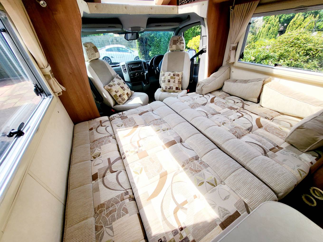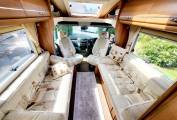 Both front seats swivel to face the 2 large rear sofas, there is a small table that mounts on a chrome pole to place your coffee or drinks. (Or Gin Table) ;)