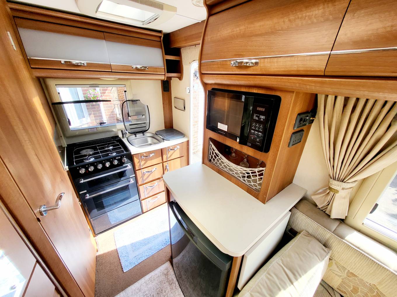 Entering the van straight into the end kitchen, immediately on your right, with a stainless steel sink, glass lid and chrome mixer tap, a dual fuel hob with 3 gas burners and an electric hotplate, gas grill and oven beneath. A Dometic fridge with freezer box, a built-in microwave oven, plus upper cabinets and lower cupboards to store away all of your holiday provisions.