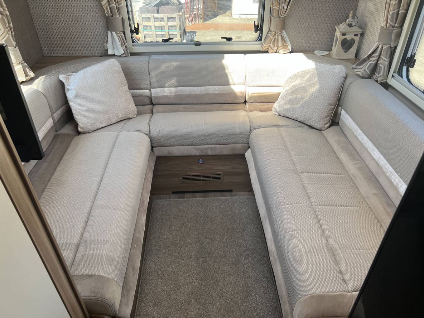 The rear U shape lounge has plenty of storage beneath and surrounding, then can be configured to create a large double bed, across the while width. There is a TV in this area and large wardrobe, with hanging rail.
