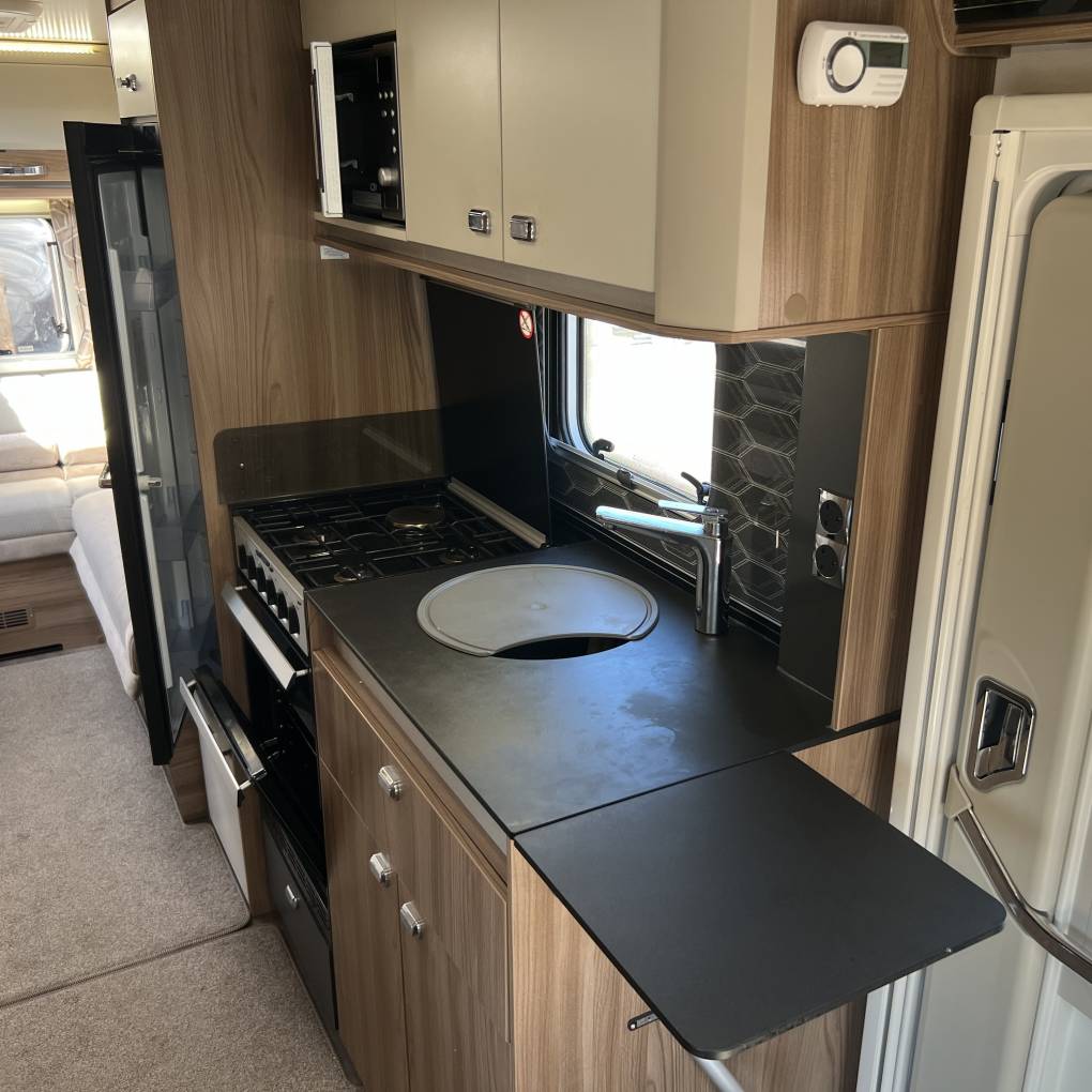 In the kitchen, there is a cooker with oven, grill, 3 gas burners and electric hob, then sink, tall fridge freezer, with plenty of storage surrounding, plus microwave and useful pop up worktop next to the habitation door.