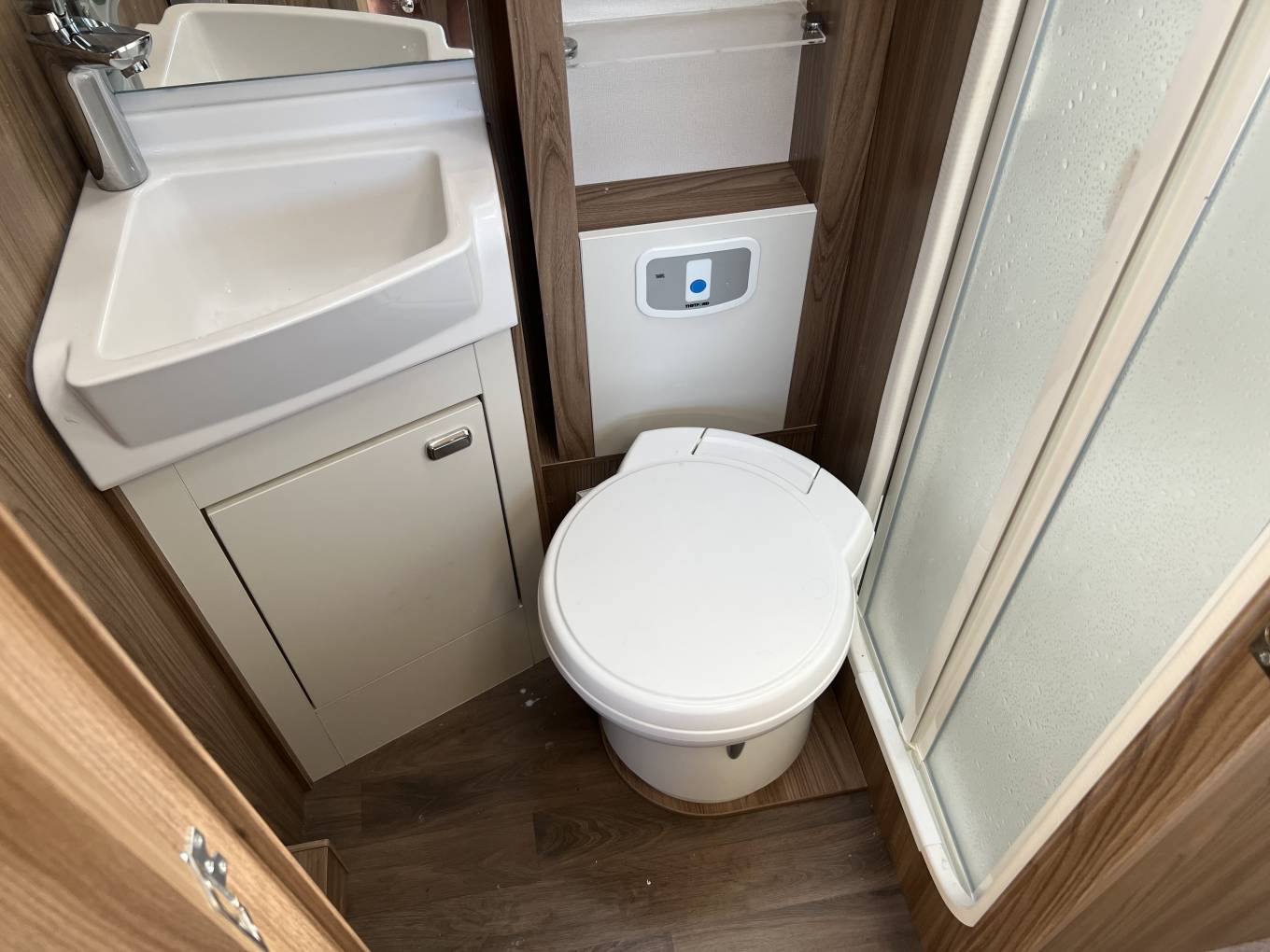 The washroom includes sink, cassette toilet, then shower, with full enclosure.