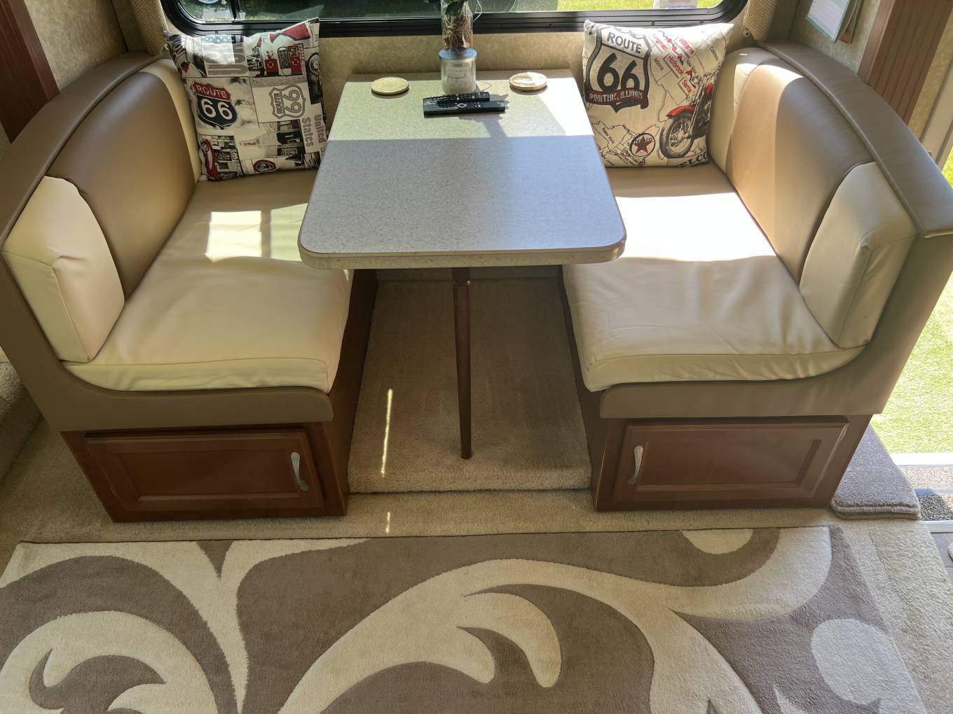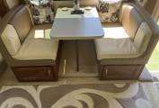 The dinette, which has 2 lapbelts facing forward, can seat 4 people and then converts into a double bed. Opposite is the comfy 3 person sofa, which also converts into a double bed and has 3 lapbelts. There is habitation air conditioning unit mounted in the ceiling