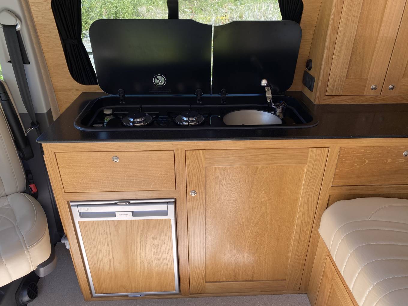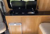 Twin burner hob with neat integrated sink, water tank and pump. Sealed gas locker with regulator and gas safety certificate