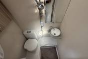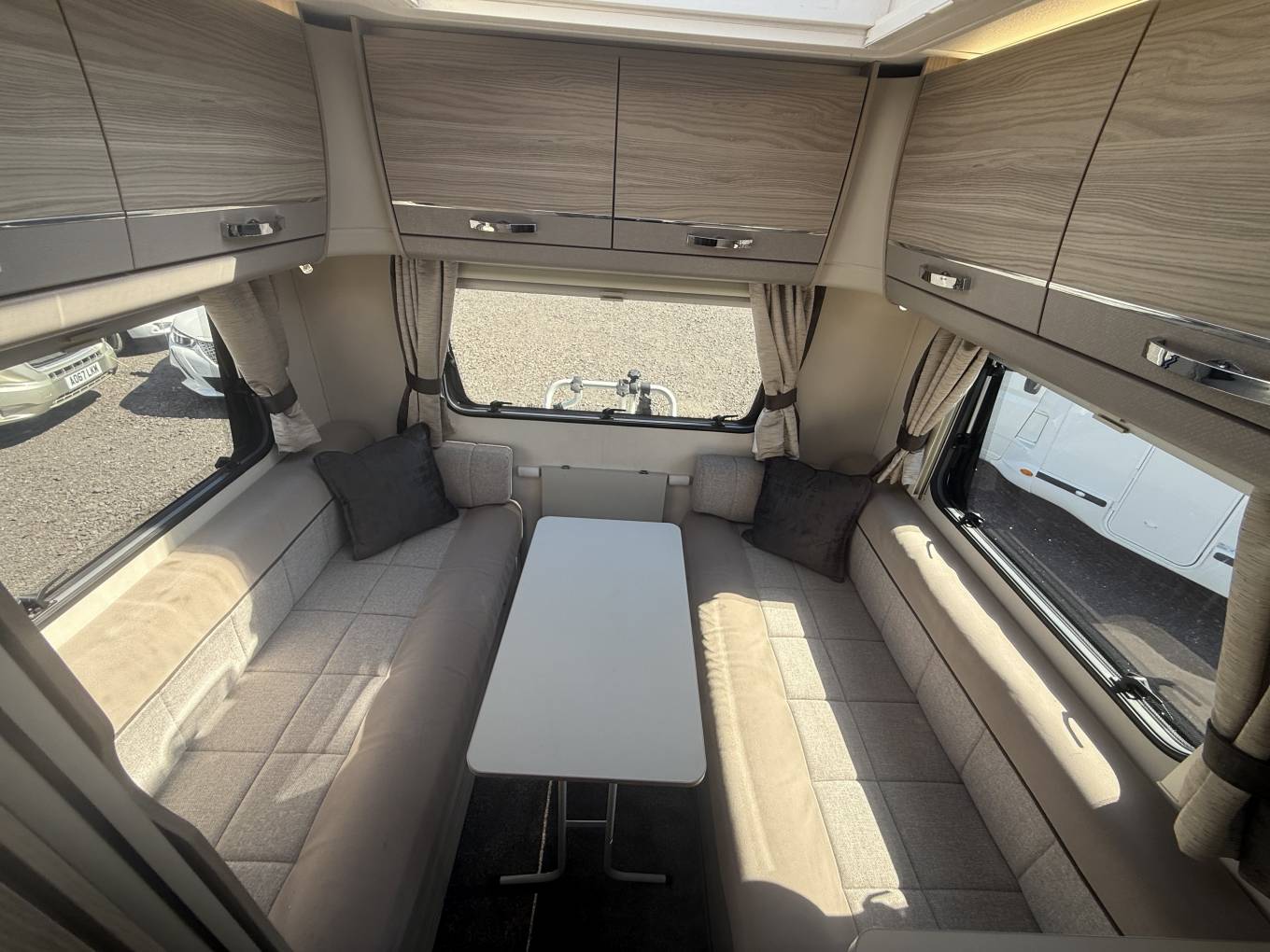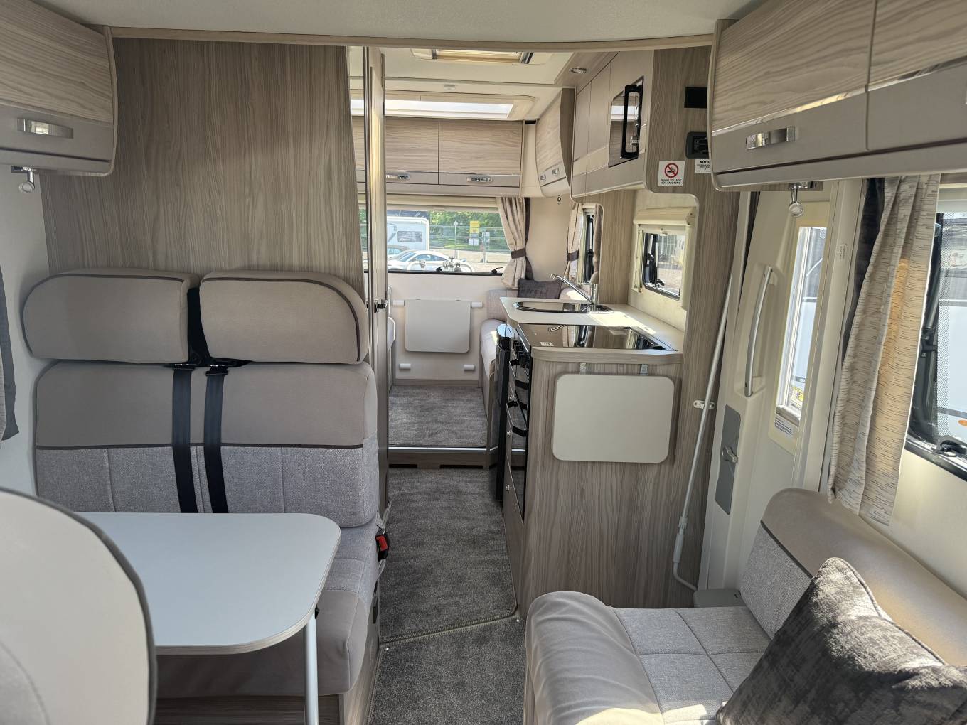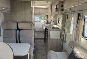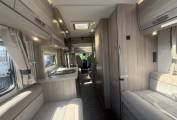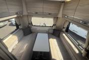 As you enter the Elddis Explorer you are greeted with the spacious modern and vibrant centre dinette area, a well designed space that also offers the first of the three sleeping areas. The front lounge is a very spacious place to sit back and relax. Above the centre dinette is the second sleeping area. This is a fully electrically operated bed that drops down over the centre dinette and has its own ladder and safety curtain. Next to the habitation door you have the kitchen area that comes well equipped with three gas hobs, one electric hot plate, oven and grill, microwave, two extra USB connections, Fridge / Freezer and good preparation space. The kitchen has access to a opening widow for great ventilation and is situated opposite the washroom. In the centre washroom you have a shower and a modern contemporary vanity basin unit and a cassette toilet. As you come to the rear you have the two long bench seats which are surrounded by large opening windows making this rear lounge very light and open making it the perfect secondary lounge with this area also making the third and final bed with a few easy steps.