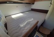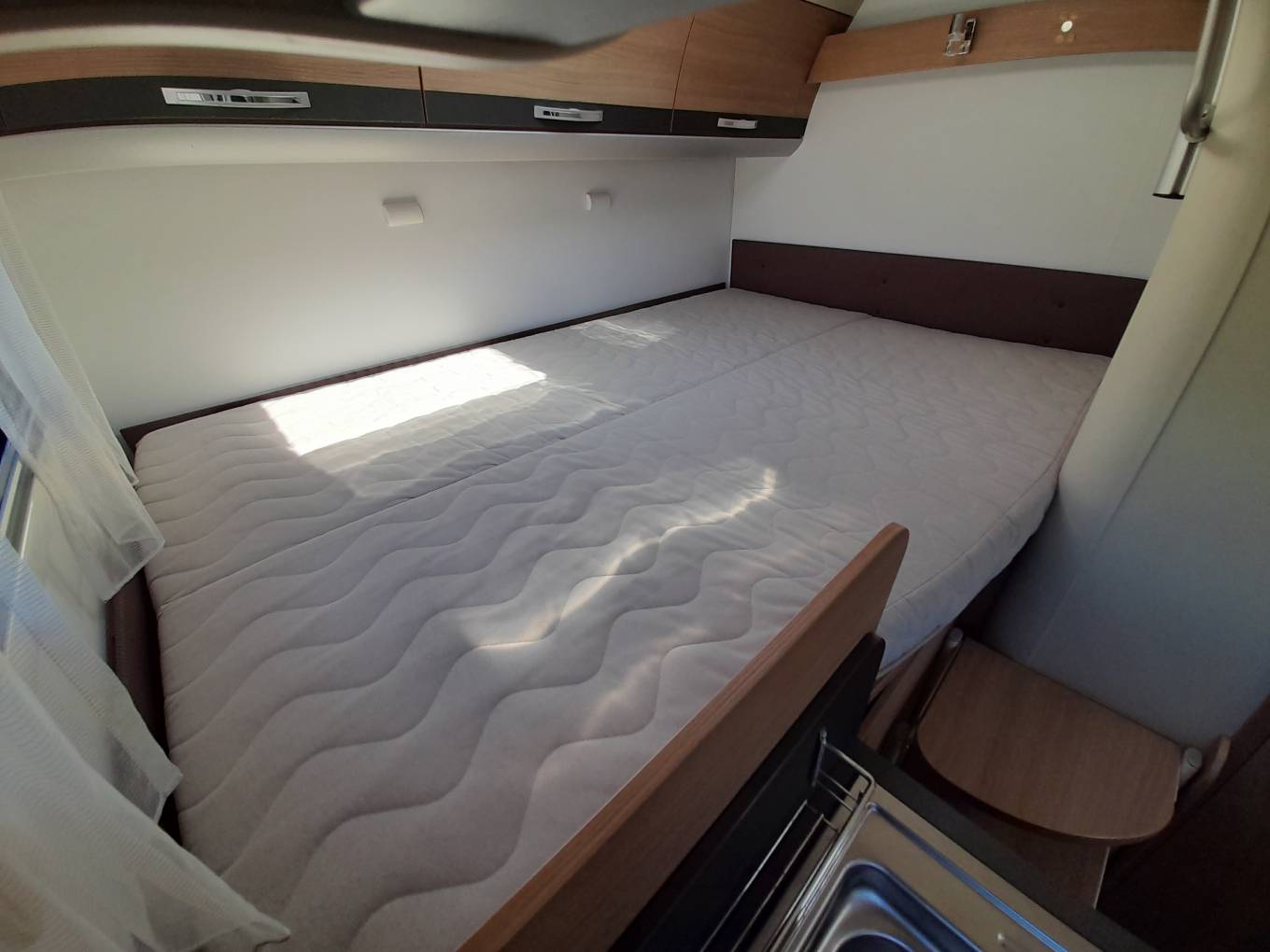 Sleeping – Raised rear Fixed double bed with over head storage lockers, reading lights and foldaway steps. Fly screen and blinds on bedroom window.