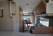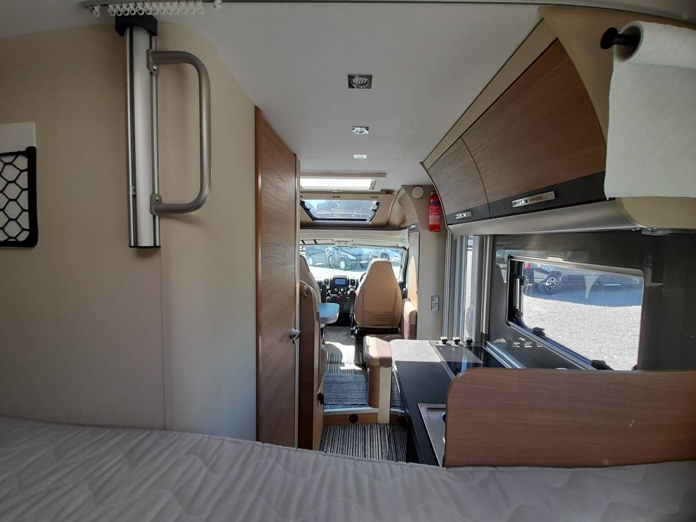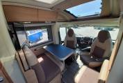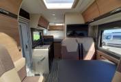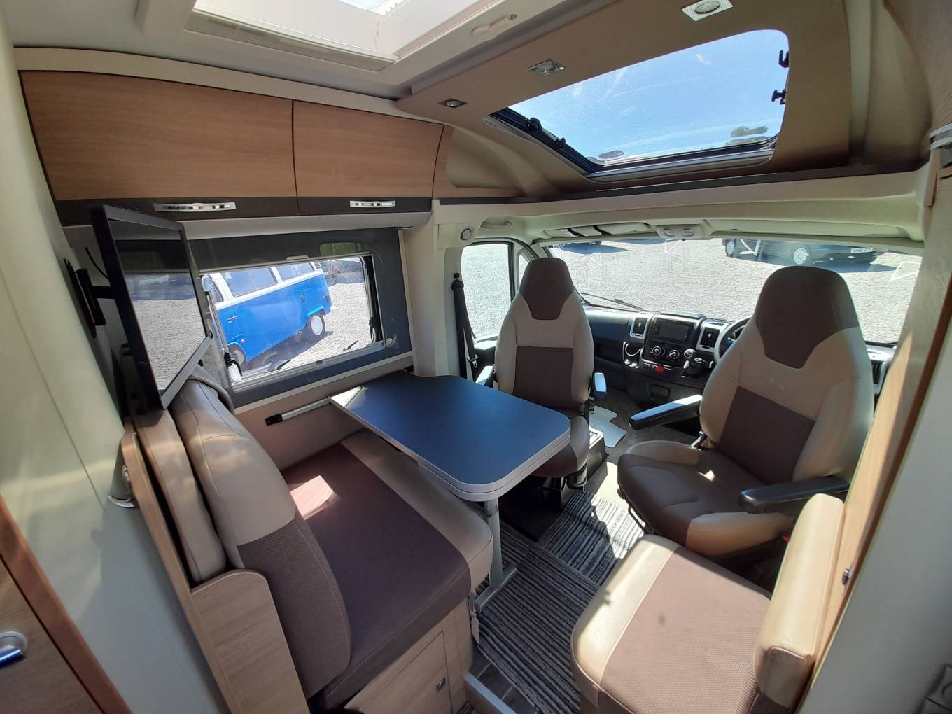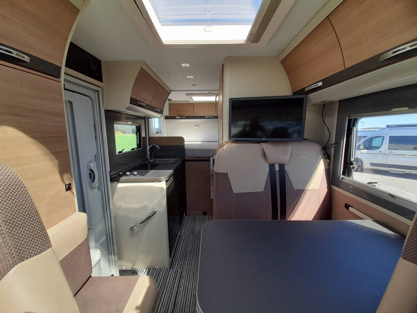 Living – Large L-shaped seating, which convert into 2 belted travel seats, TV, Table, Cab seats with arm rests and swivel bases, curtains and fly screens on all windows