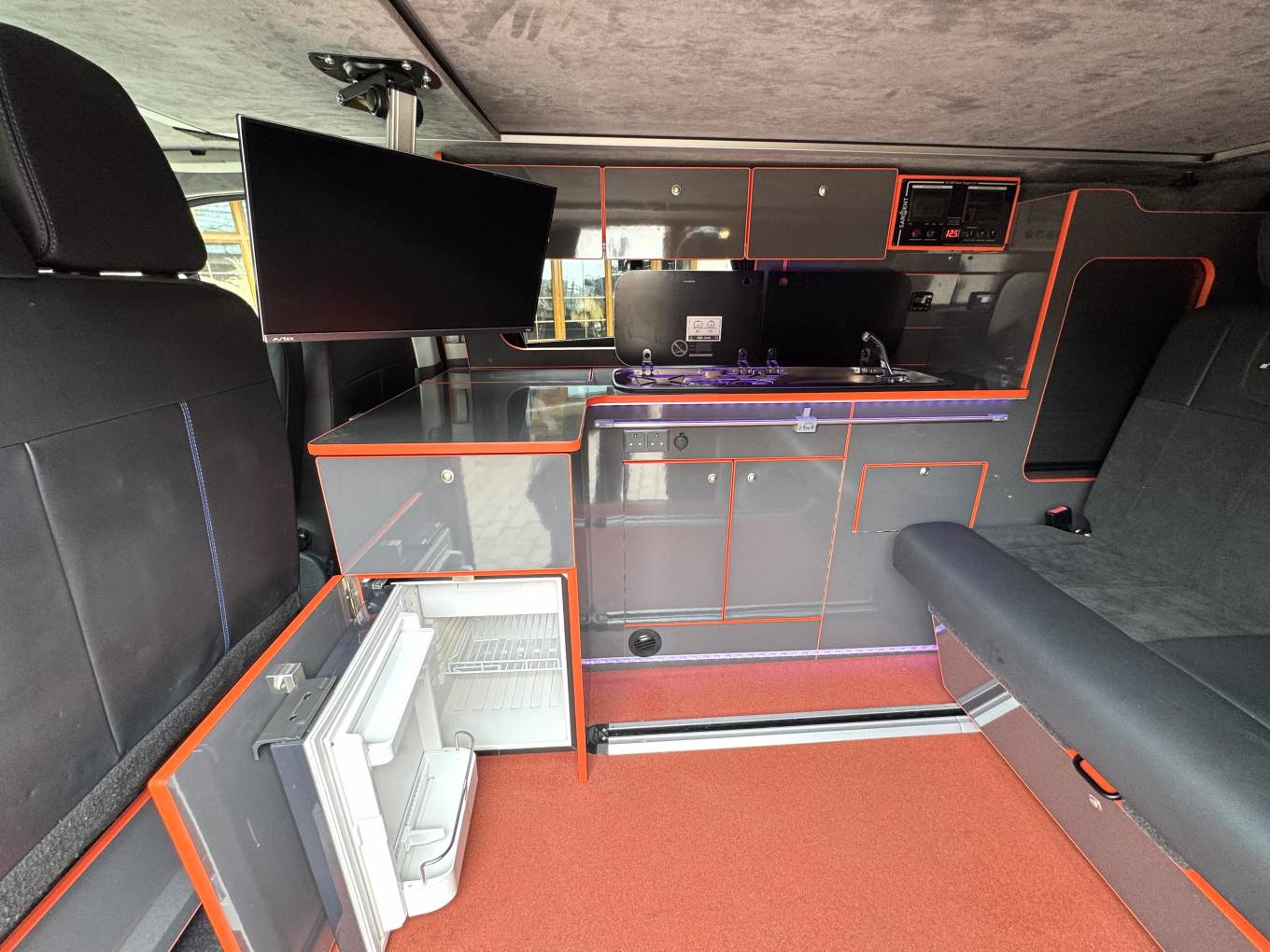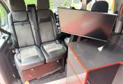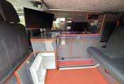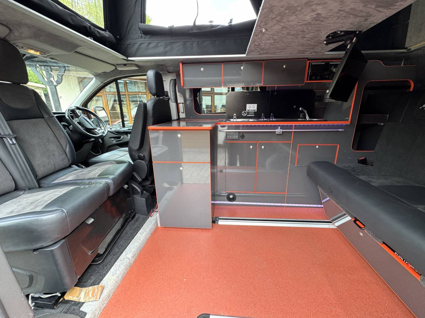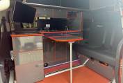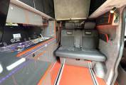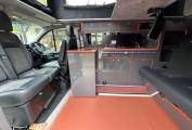 The van is fitted with a Hi-Lo pop top roof, offering additional sleeping space and standing room. Inside, the layout includes a sliding rock ‘n’ roll bed system, captain double passenger seats, and a well-designed kitchen area. The kitchen is equipped with a two-burner gas hob, countertop fridge, domestic integrated fridge, ample storage options, an underslung water tank, and an underslung gas tank. There are also double-sided external gas points, adding versatility to the cooking setup.