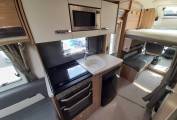 Kitchen –3 x Burner gas hob with electric hot plate, integrated sink with Hot and cold running water, 12 v fridge freezer, good storage including large pull-out drawers, 240v power plugs and lighting.