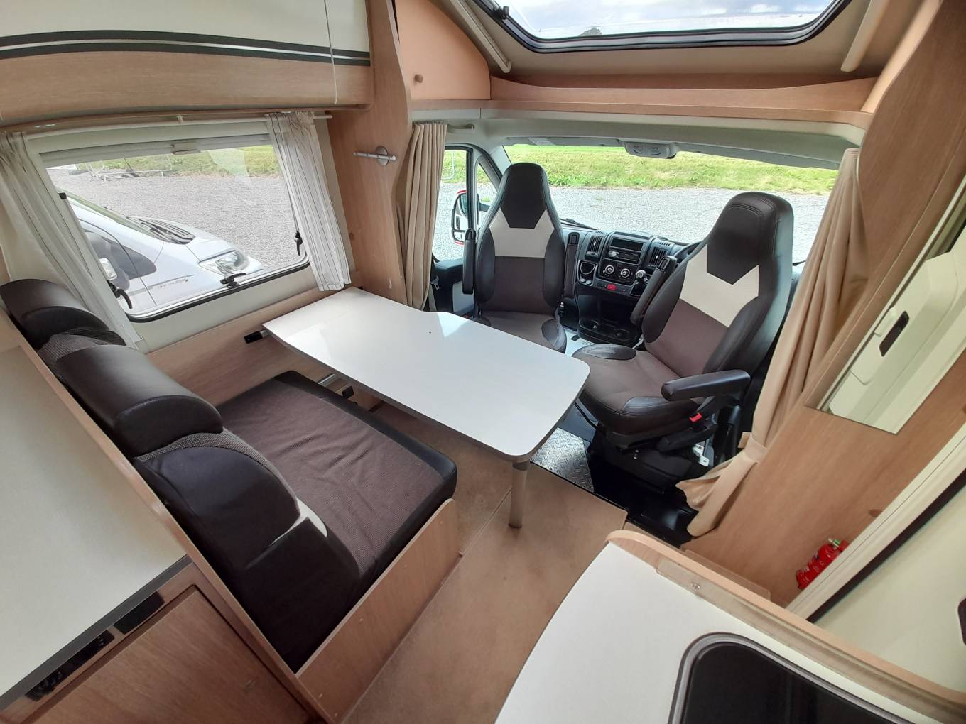 Living – Half dinette, which converts into 2 belted travel seats, Extending Table, Cab seats with arm rests and swivel bases, curtains and fly screens on all windows