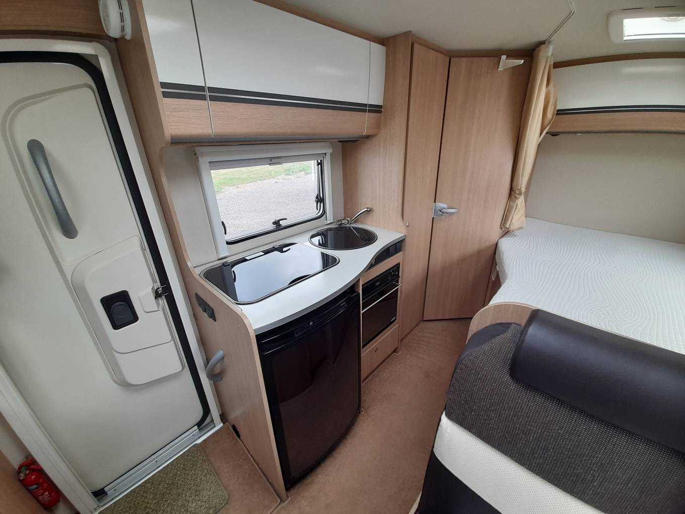 Kitchen – 3x Burner gas hob, Oven & Grill Sink with Hot and cold running water, 3-way fridge freezer, good storage for all your kitchen needs including 240v power plugs and lighting.