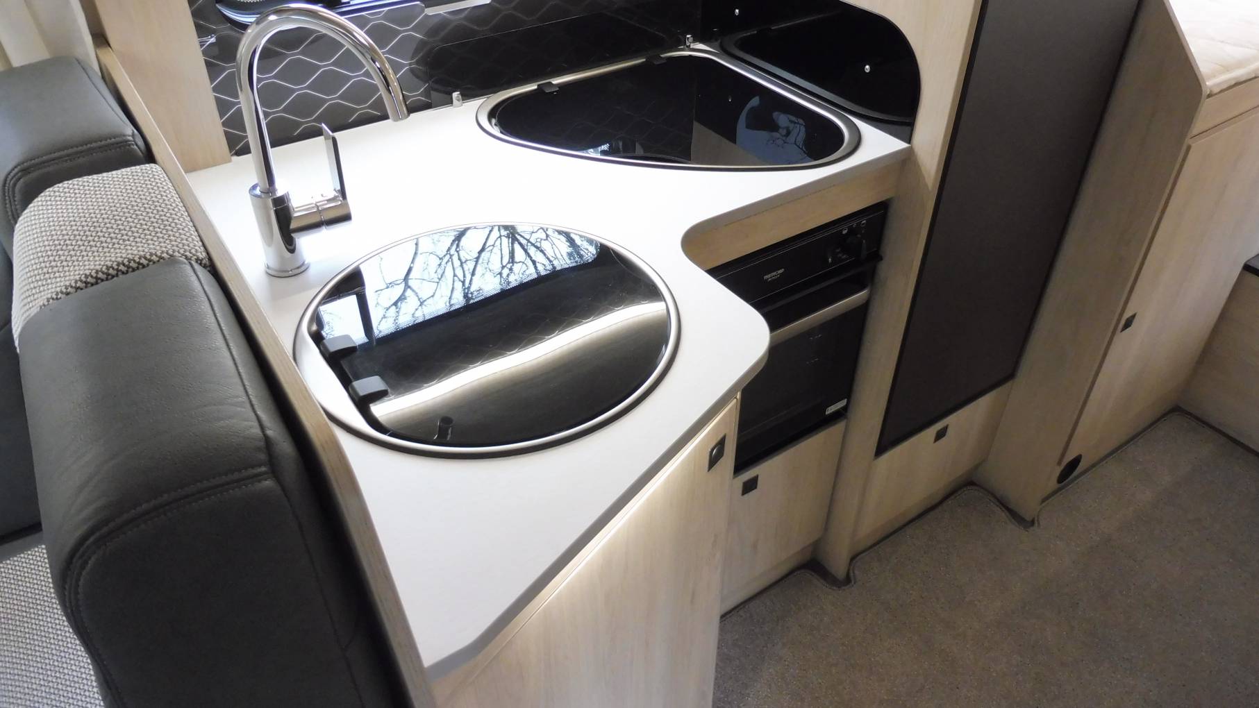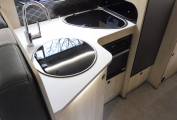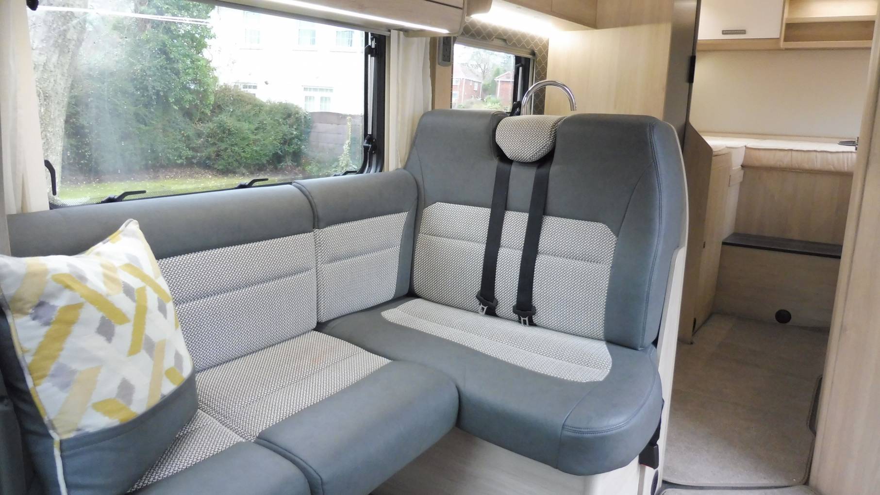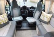 At the front of the motorhome you find a large seating area that benefits from two captain’s chairs to supplement the settees and a table which can be stored under the rear bed when not required.