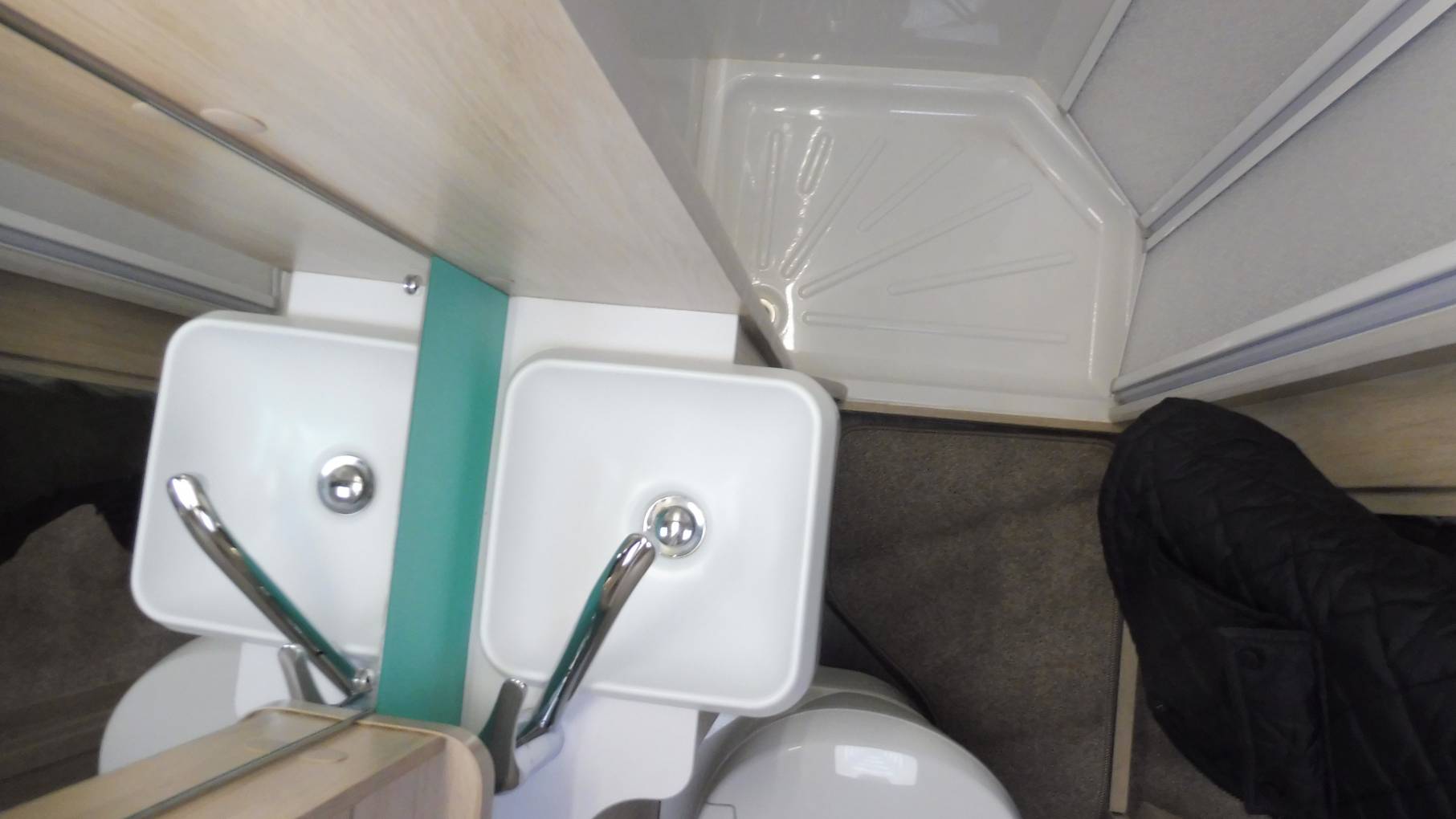 It has a well-equipped kitchen with a large fridge, sink, 3 burner gas hob and combination oven. As you will see from the pictures the kitchen has barely been used. Opposite is the bathroom fitted out with a toilet, sink and separate shower cubicle all in excellent condition.