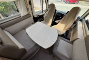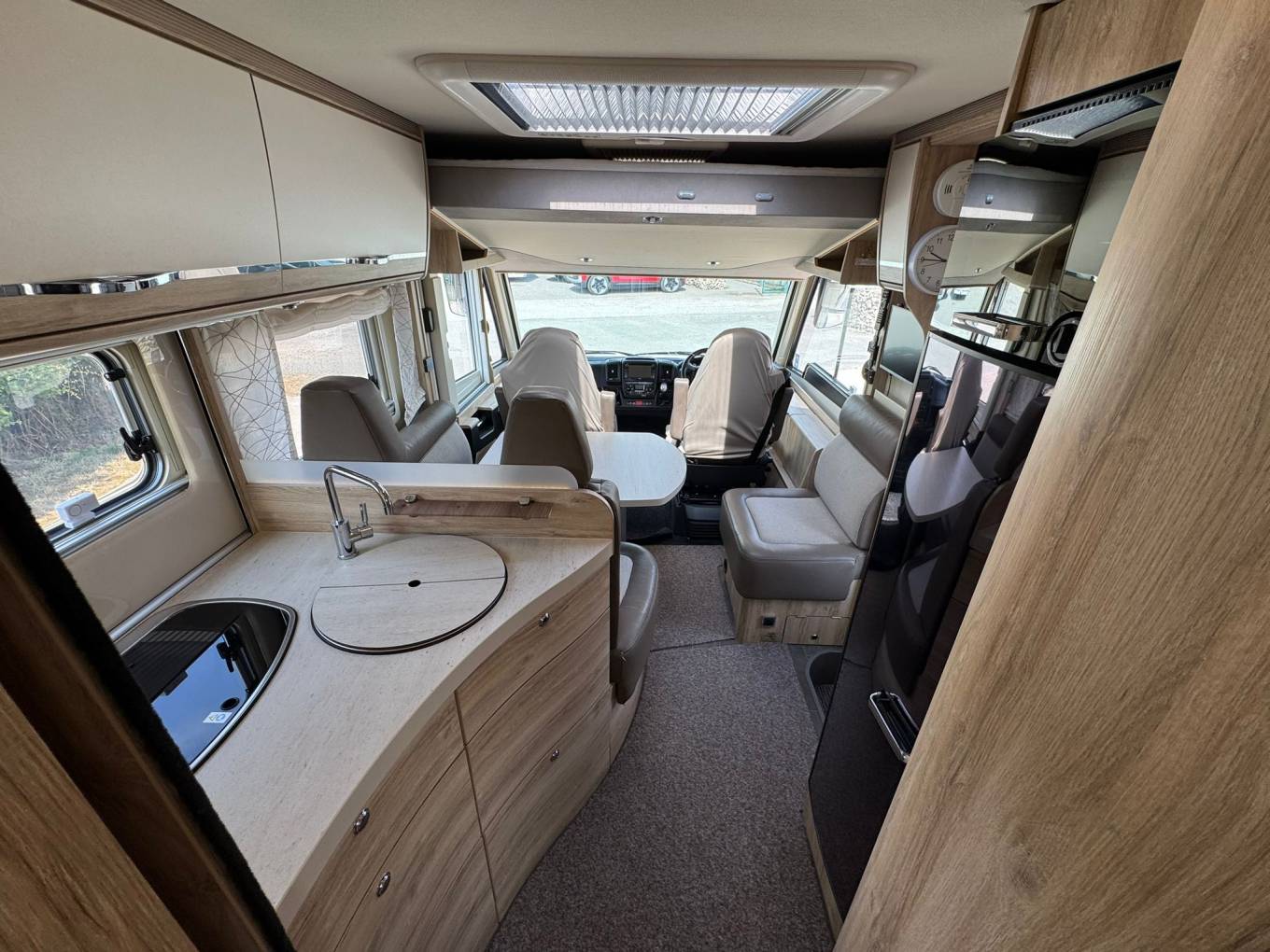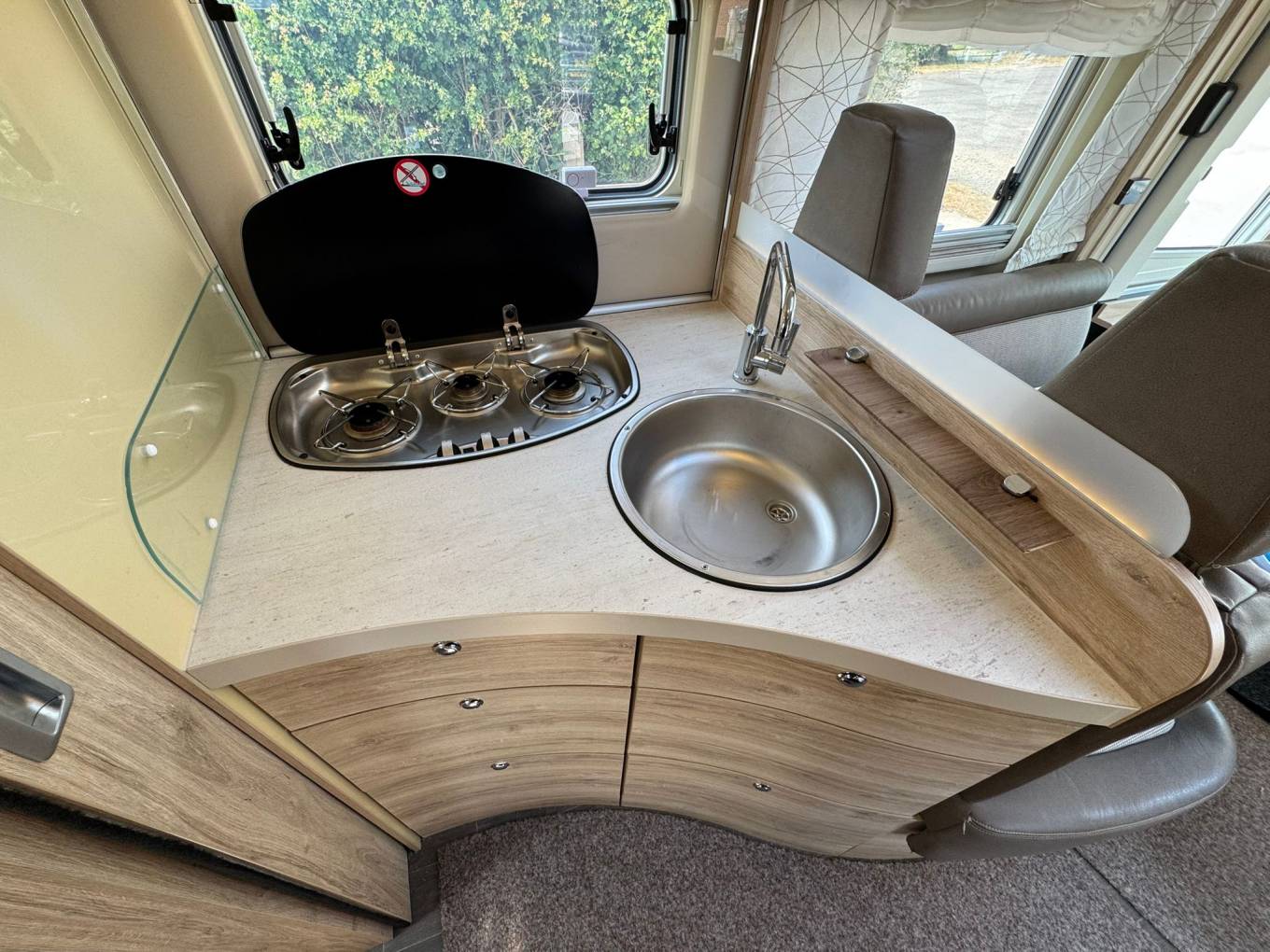 Upon entering the Eura Mobil Integra Line 720QF, you're immediately greeted by a thoughtfully designed, spacious kitchen area, perfectly equipped for life on the road. This well-appointed space includes a tall fridge freezer, oven, sink, and a hob top, making meal preparation both easy and enjoyable.
