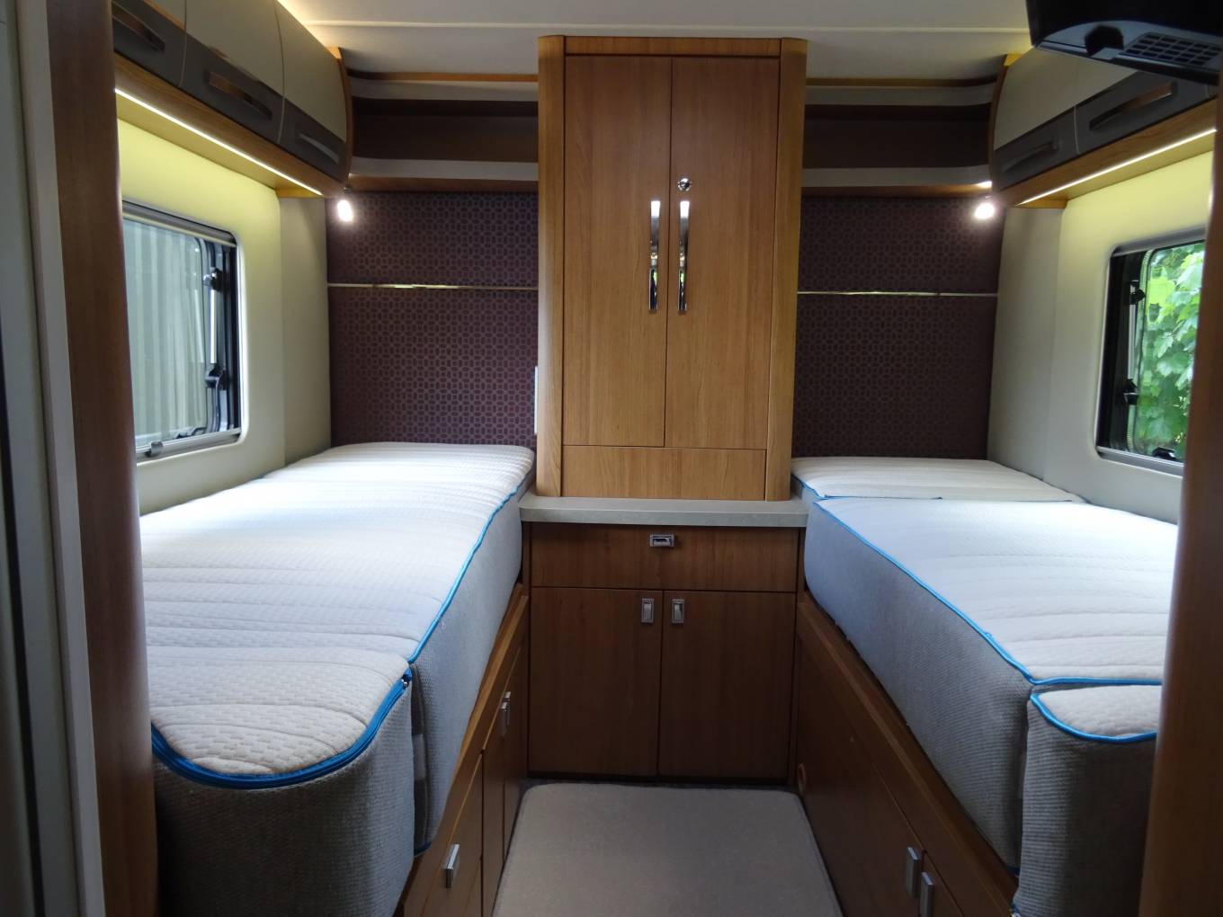 At the rear you have 2 separate fixed single beds that sit above the full width end garage which is great to store your larger items. The rear bedroom has other forms of storage as you can see the single beds sit either side of an exceptionally large wardrobe with hanging rail and large opening drawers. For entertainment the rear bedroom has a TV.