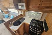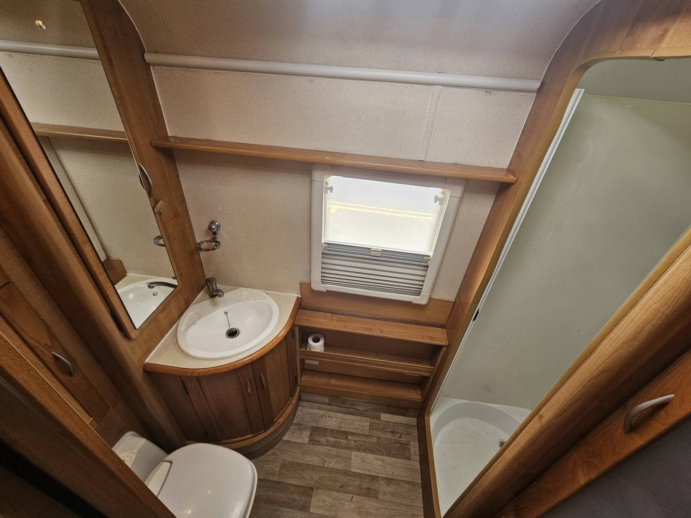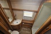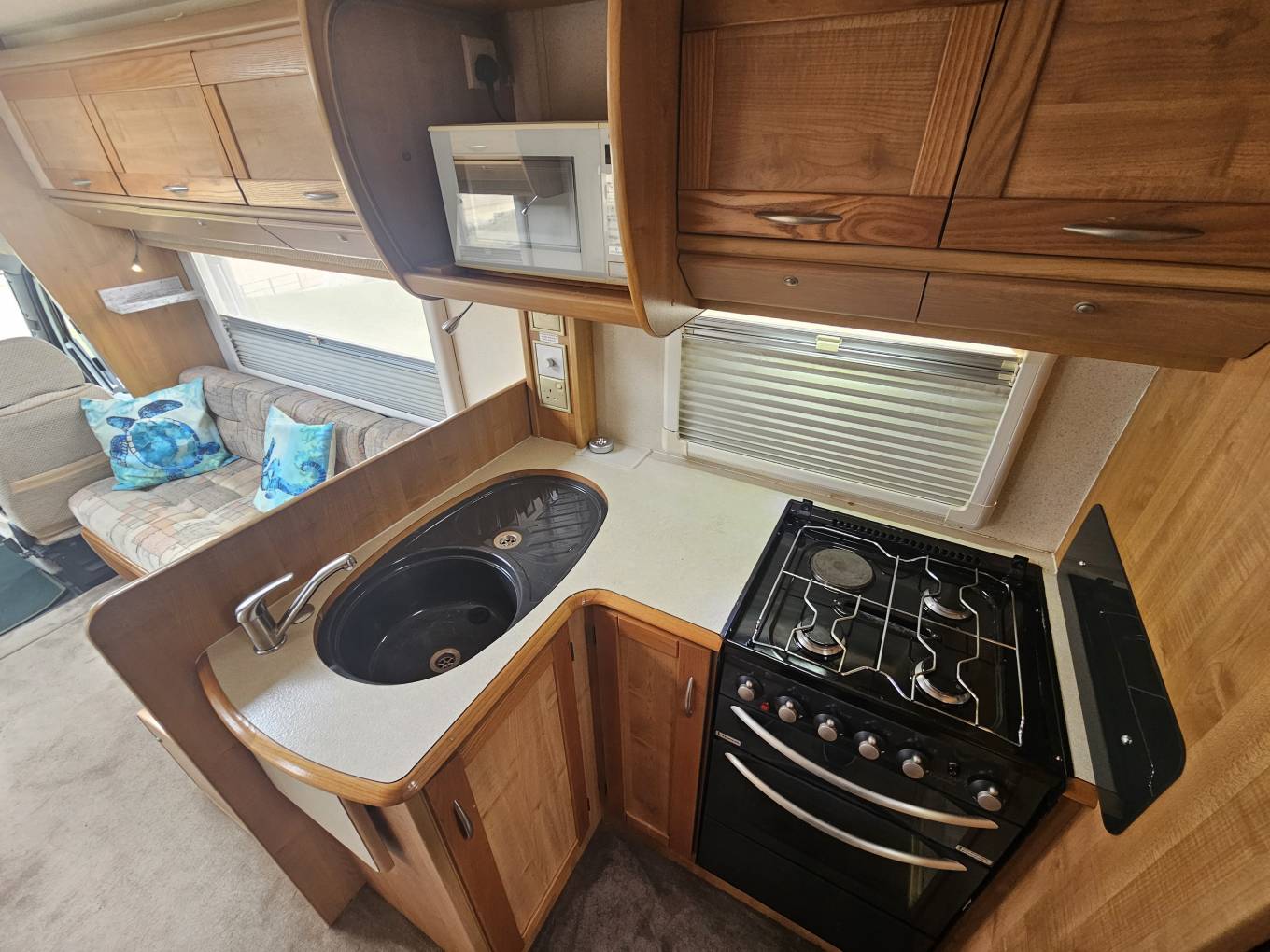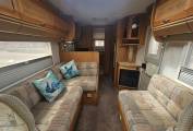The layout is practical and comfortable, featuring a central dinette with two seatbelts that converts into a large double bed. At the rear, the end kitchen includes a 3-burner gas hob, grill, oven, stainless steel sink, and fridge. The spacious washroom has a cassette toilet, hand basin, and a separate shower cubicle, Storage is generous throughout with multiple overhead lockers and a good-sized wardrobe.