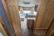 Onboard systems include gas and electric heating and hot water, along with two 6kg propane bottles, two leisure batteries, and a 1000W inverter. It also features a solar panel, reversing camera, wind-out awning, and tow bar, offering flexibility for both on-grid and off-grid camping. Standard electric hook-up. The exterior shows signs of age-related wear and tear consistent with its year and mileage.