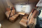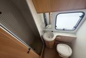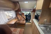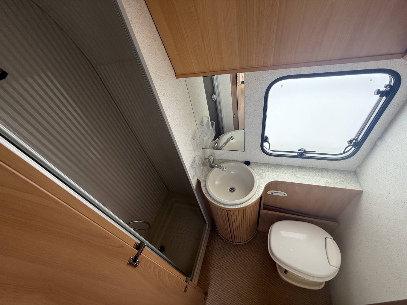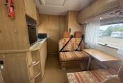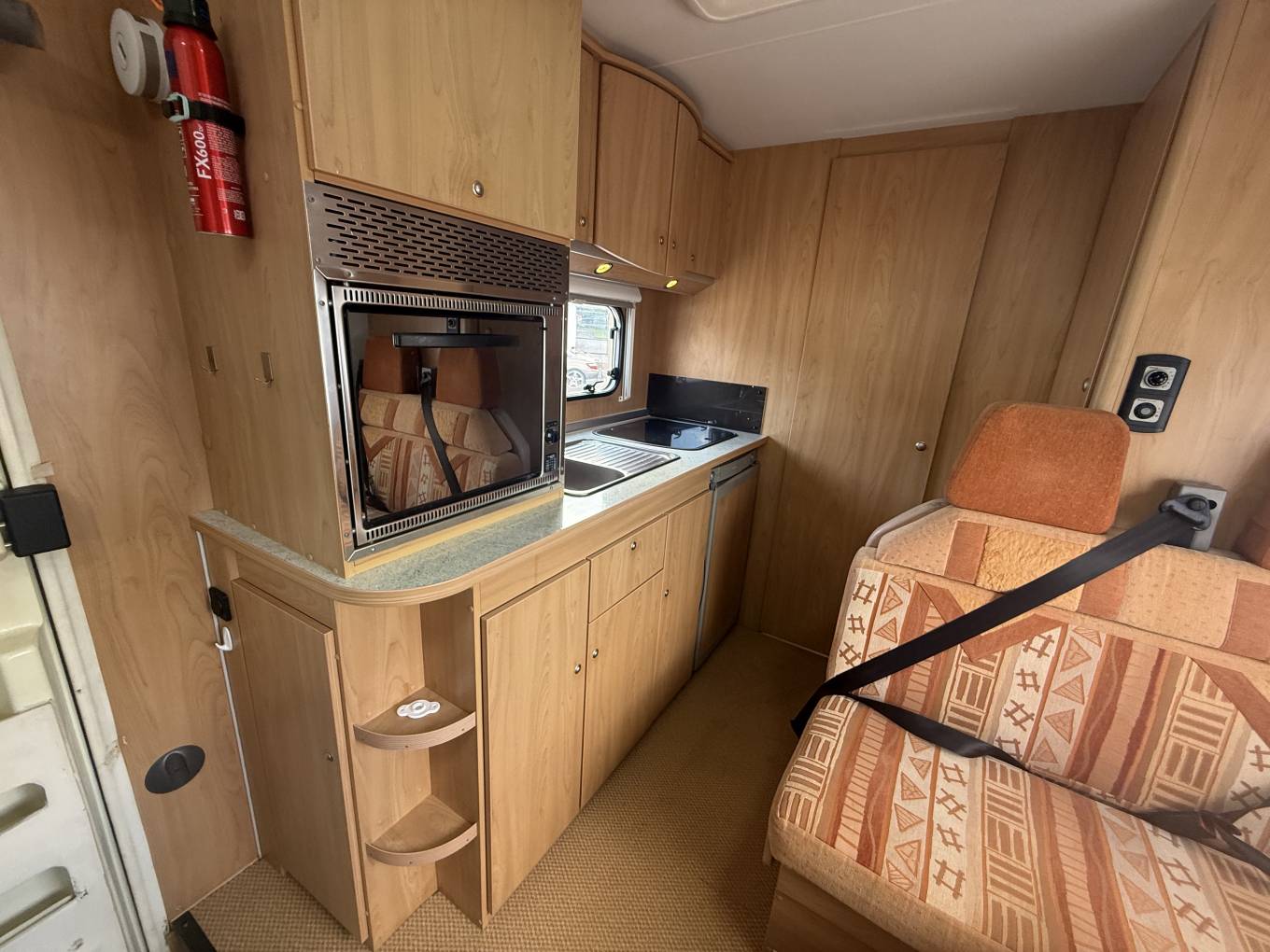 The layout is from entering the side of the motorhome you step into the middle dining / lounge area which also converts into a double bed, there is 2 different sized dining lounge tables for this area with the one table not being used being kept in the large cubpoard in this area. Opposite this is the kitchen area consisting of an oven and grill, 3 gas hobs, fridge with freezer compartment and a sink with drainer. Moving to the front the over cabin bed is also a very large double bed and has a fall out safety net fitted for children sleeping in this area or for using more for a holding storage area when travelling. To the back of the motorhome is a large transverse ensuite washroom with window, toilet, washbasin and separate shower.