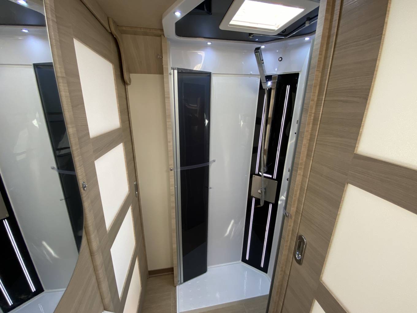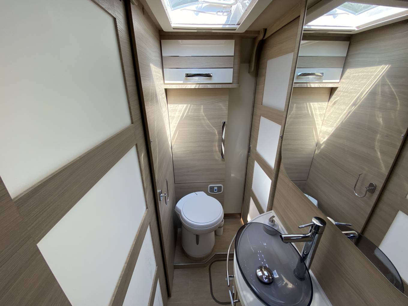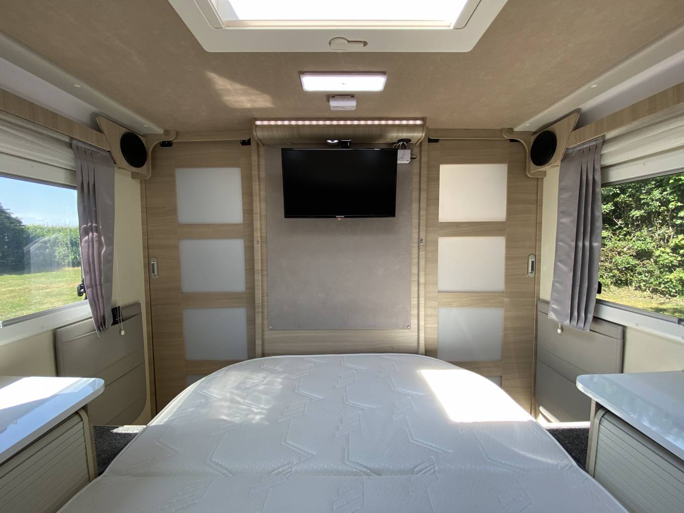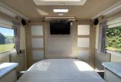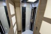 Moving through the door that separates front to rear is the bathroom area with a centrally situated sink and vanity unit and on either side is the toilet and separate shower cubicle with Perspex doors. The bedroom has an island bed (electrically adjustable) with hanging wardrobes either side. At the foot there is a TV. Heating & Hot water is supplied by Truma blown air combination boiler that can be powered by gas or electric. Outside there is a bbq point, a shower point, awning,