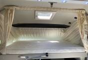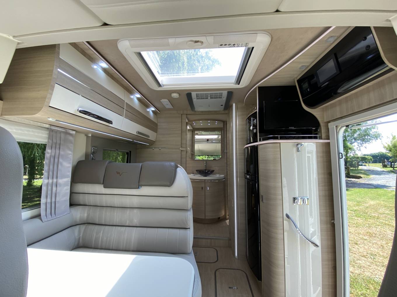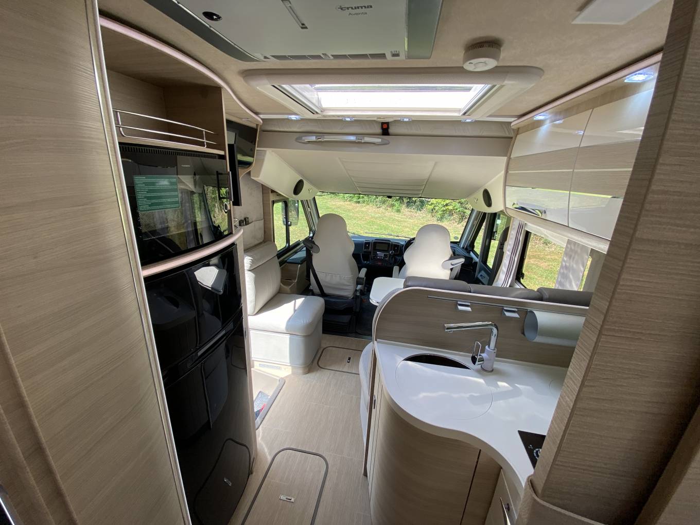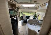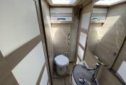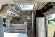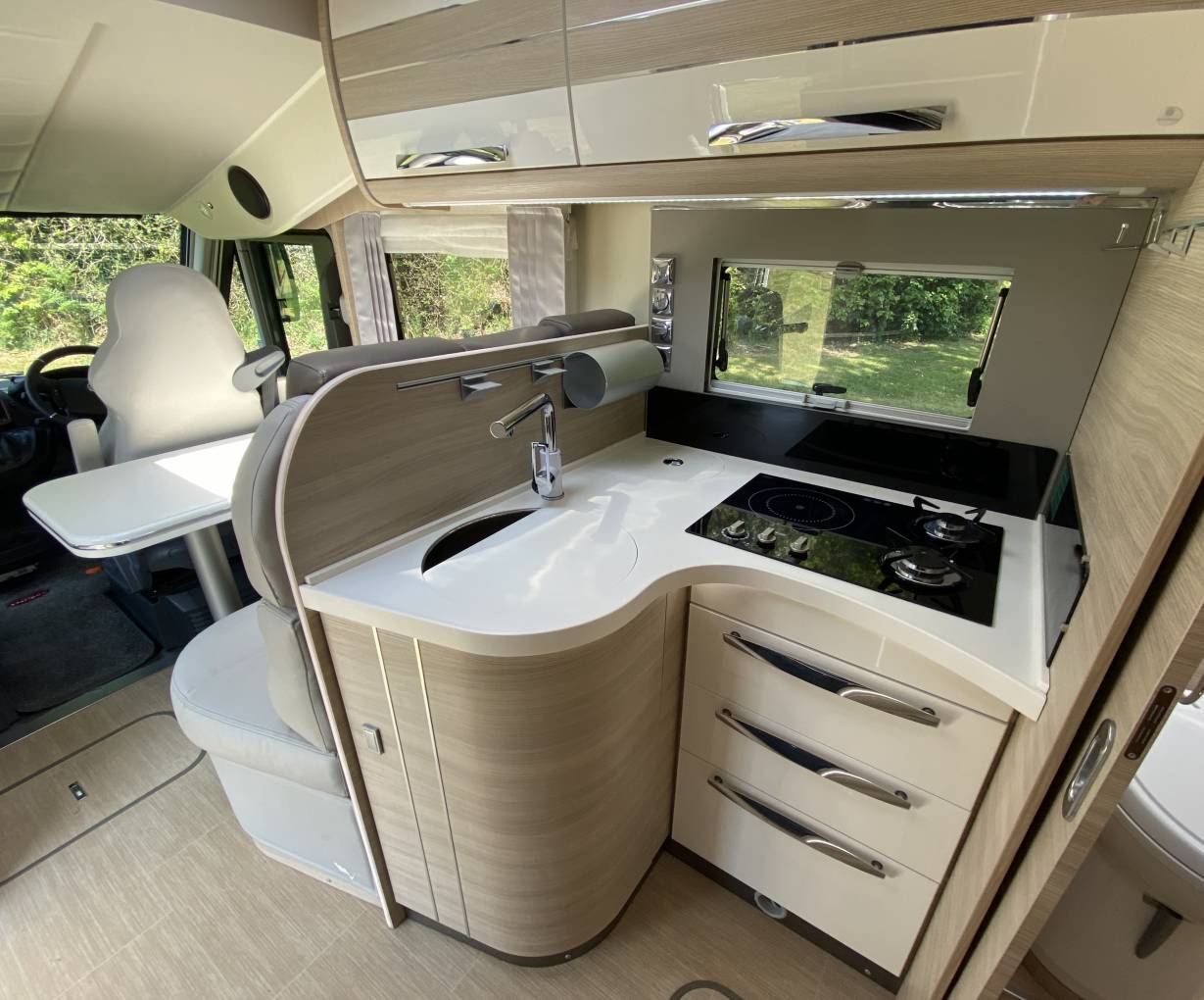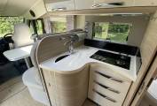 The lounge has a single seat and a large L shaped sofa with 2 forward facing travelling seats with 3 point seat belts. Swivelling the captains seats means you can sit 6 people around the table for dining etc. Above the cab is double drop-down bed. An L shaped kitchen has good work surfaces, stainless steel sink, Thetford induction hob and 2 gas burners, a 12 volt extractor fan, a waste bin. There is a large 3-way fridge with separate freezer, condiment rack, a Dometic oven/grill and loads of cupboard and drawer space.