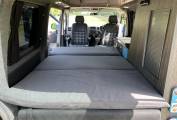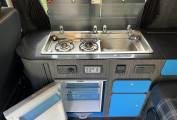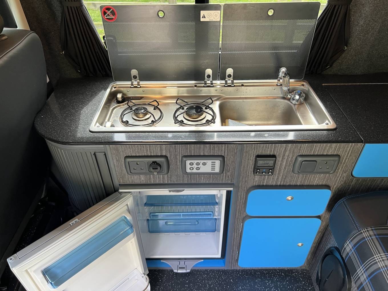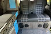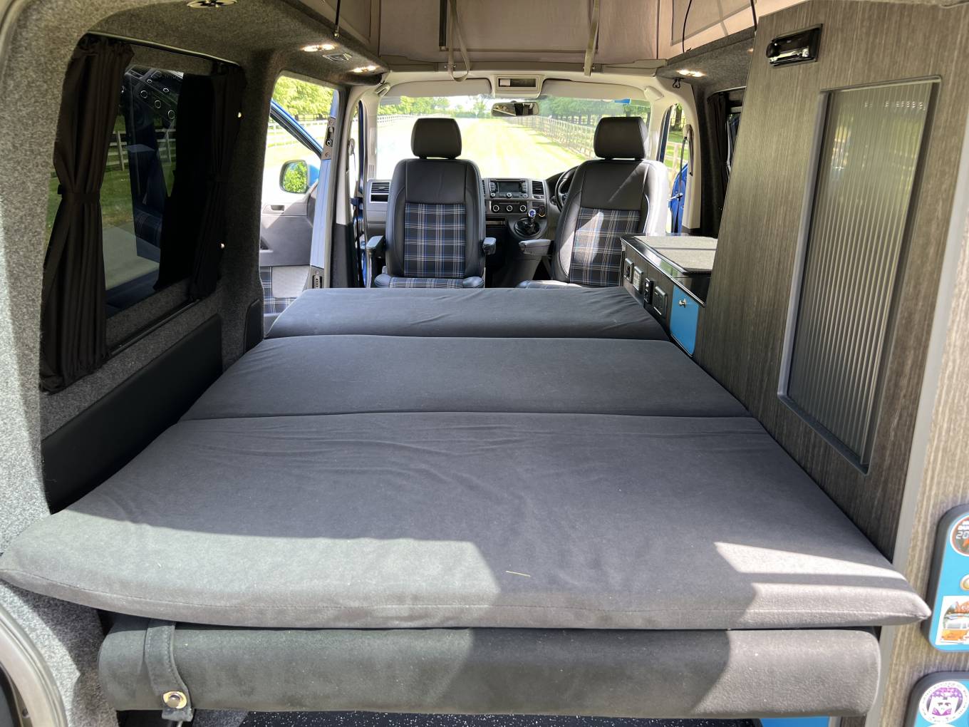 Internally, it has half leather upholstery, based on Golf Gti styling, 240V and 12V sockets, USB points, full central locking, multifunction steering wheel, blackout curtains, Erbespacher diesel heater, spotlights in the rear tailgate. A handy storage facility that can be removed to let the seats swivel up front is a “unique” feature, as is the radio in the rear, which operates independently of the dashboard mounted media centre.