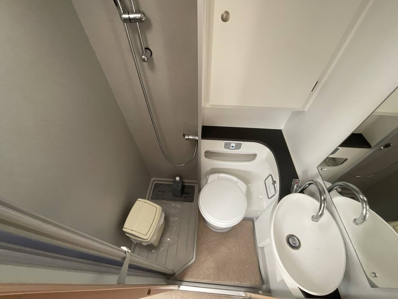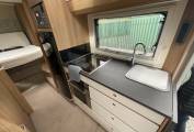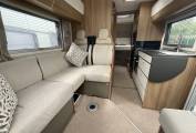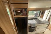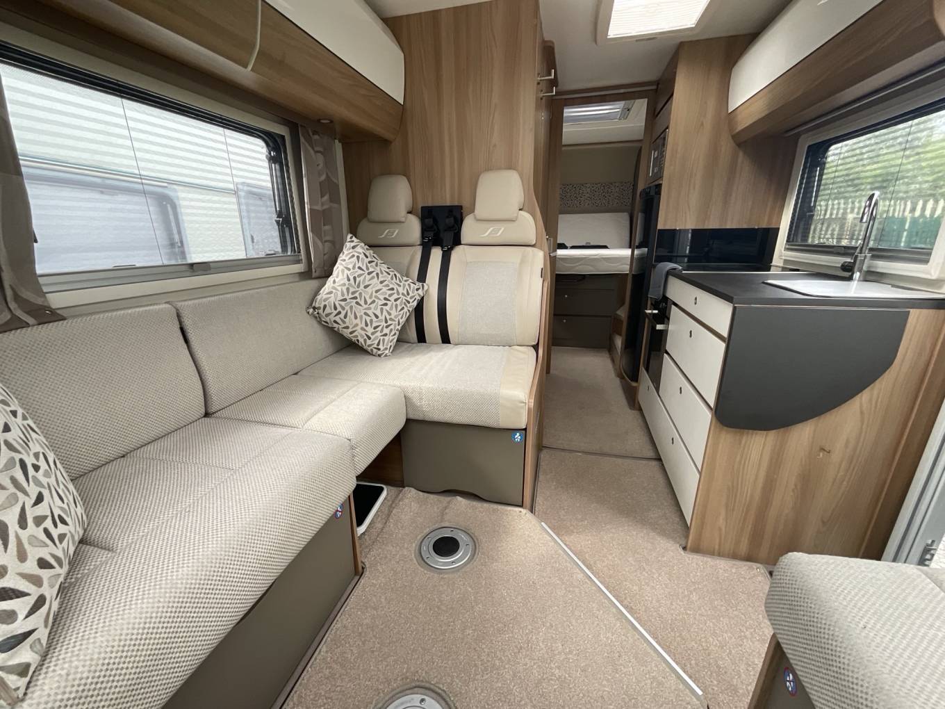 As you step into the habitation area, the lounge/dining area has an L-shaped sofa and a single seat opposite. With the two Captain’s chairs swiveled into the area, there is plenty of room for six to dine in comfort. There is also a TV in the lounge area. In the center of the motorhome, you have the very well-appointed kitchen area complete with 3-burner gas hob with one electric plate, oven/grill, stainless steel sink with mixer tap, large 3-way fridge/freezer and a microwave. There is good work-top space for prep work and plenty of storage in the drawers and a large cupboard above. On the opposite side you have the washroom complete with separate shower unit with bi-fold door, Thetford cassette toilet with electric flush, washbasin with mixer tap and a storage cupboard. The bedroom with sliding privacy door at the rear is a lovely space with a large double island bed with easy access on both sides, large underbed drawers, a wardrobe either side of the bed and a couple of lockers. The dual fuel programmable Alde system provides heating to the radiators and hot water and there are removeable carpets fitted throughout, flyscreens and blinds on all windows and a sliding flyscreen on the habitation door.