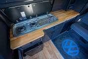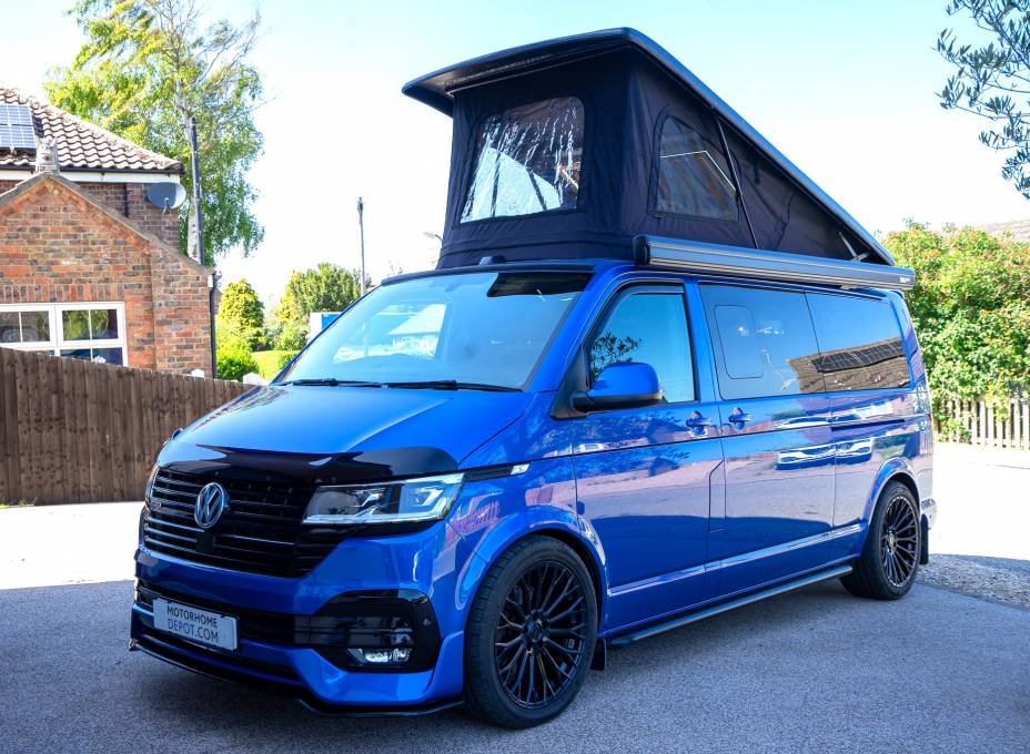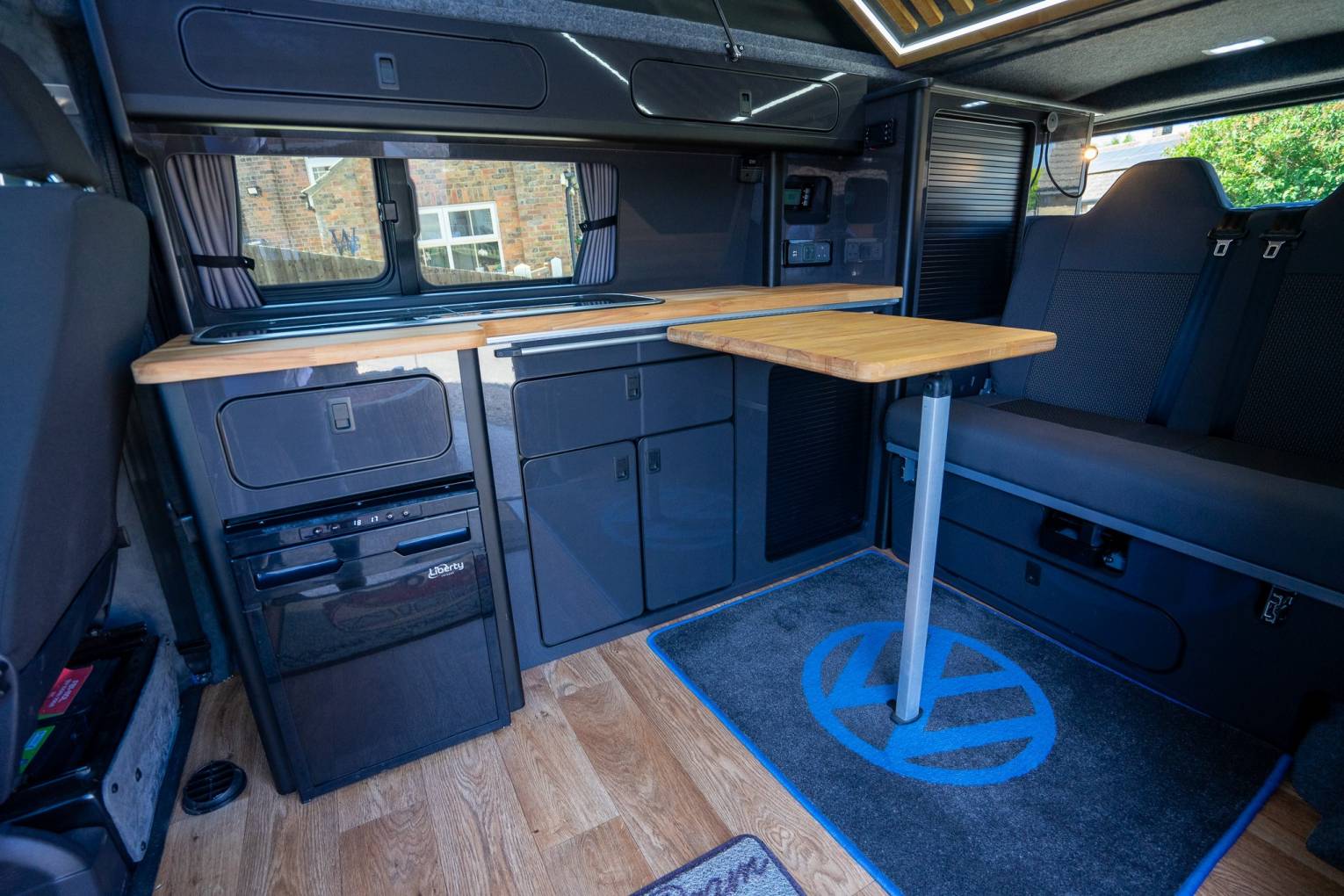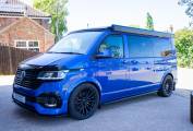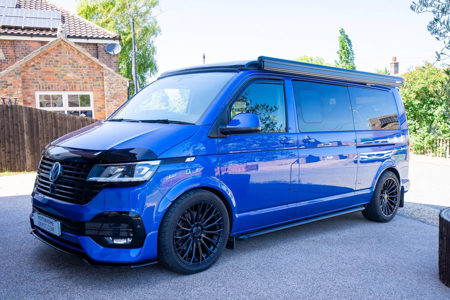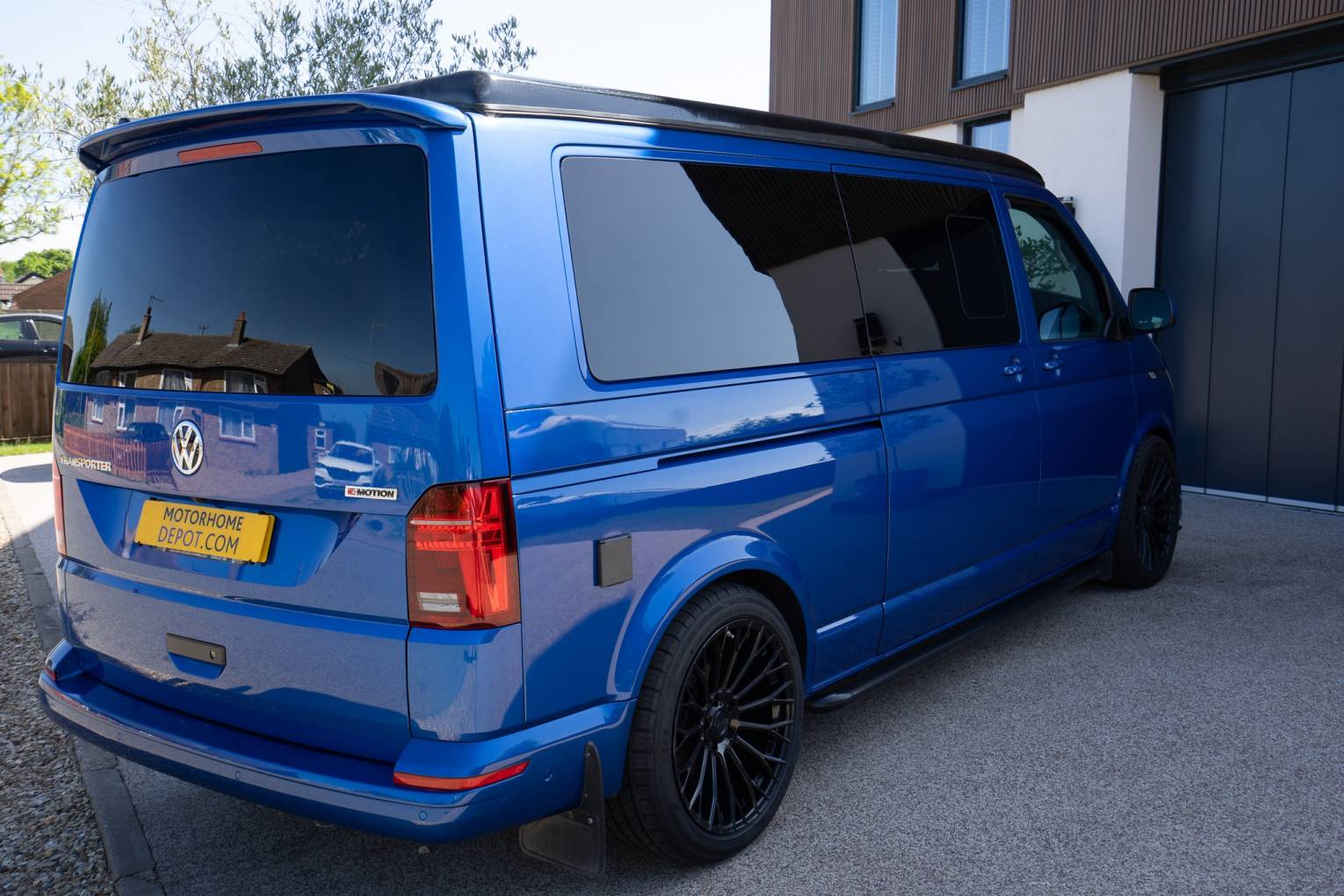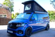 Superb Side Conversion by VW Dubz supplied by Autocraft Motor Caravans and finished in Gloss Grey with Real Wood worktop and Tables finished in the Stunning Ravenna Metallic Blue, with Black Roof, Sports Front Spoiler/splitter and Rear Roof Spoiler. Complimented by 20in upgraded black alloy wheels and Black Chrome Side Bars. Top of the range Highline Specification.