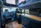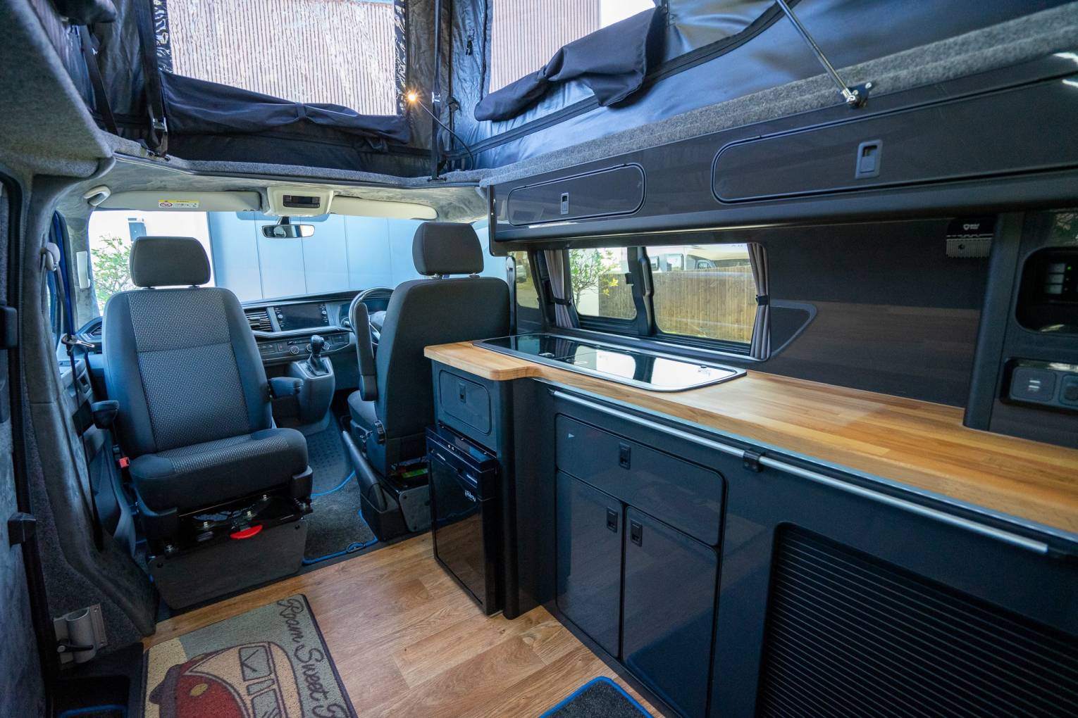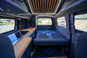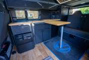 Rock & Roll bed, Scenic View Pop Top, Large Double bed in Roof, Electric Hook Up, Gas Hob & Sink with Tap, 12v Fridge, Diesel Heater. Adjustable Table in Real wood finish matching worktops, Additional matching 2nd Table. Fitted into the Long Wheel Base for maximum room and Comfort available in a Transporter.