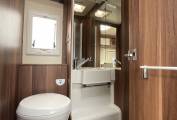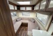 The generous rear lounge is the star of the show with its spacious six foot settees converting at night into twin singles or a large double bed. Deep bolster cushions enhance seating comfort, stylish Roman blinds adorn all the panoramic windows and there’s a free-standing table for dining and entertaining.The dark wood furniture with white centers to the cupboard doors adds a further feeling of quality and that shows thought has gone into the design detail throughout.