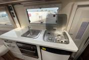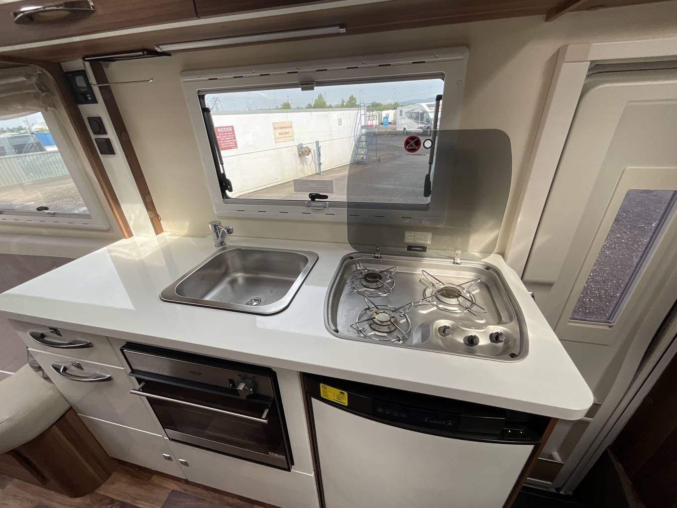The modern well lit galley kitchen runs from the doorway back along the nearside wall and includes a combination fridge freezer, a Dometic 3 gas burner hob, a Thetford Duplex oven/grill, a stainless sink with mixer tap and plenty of worktop space.There is a separate microwave to sit on the counter top.